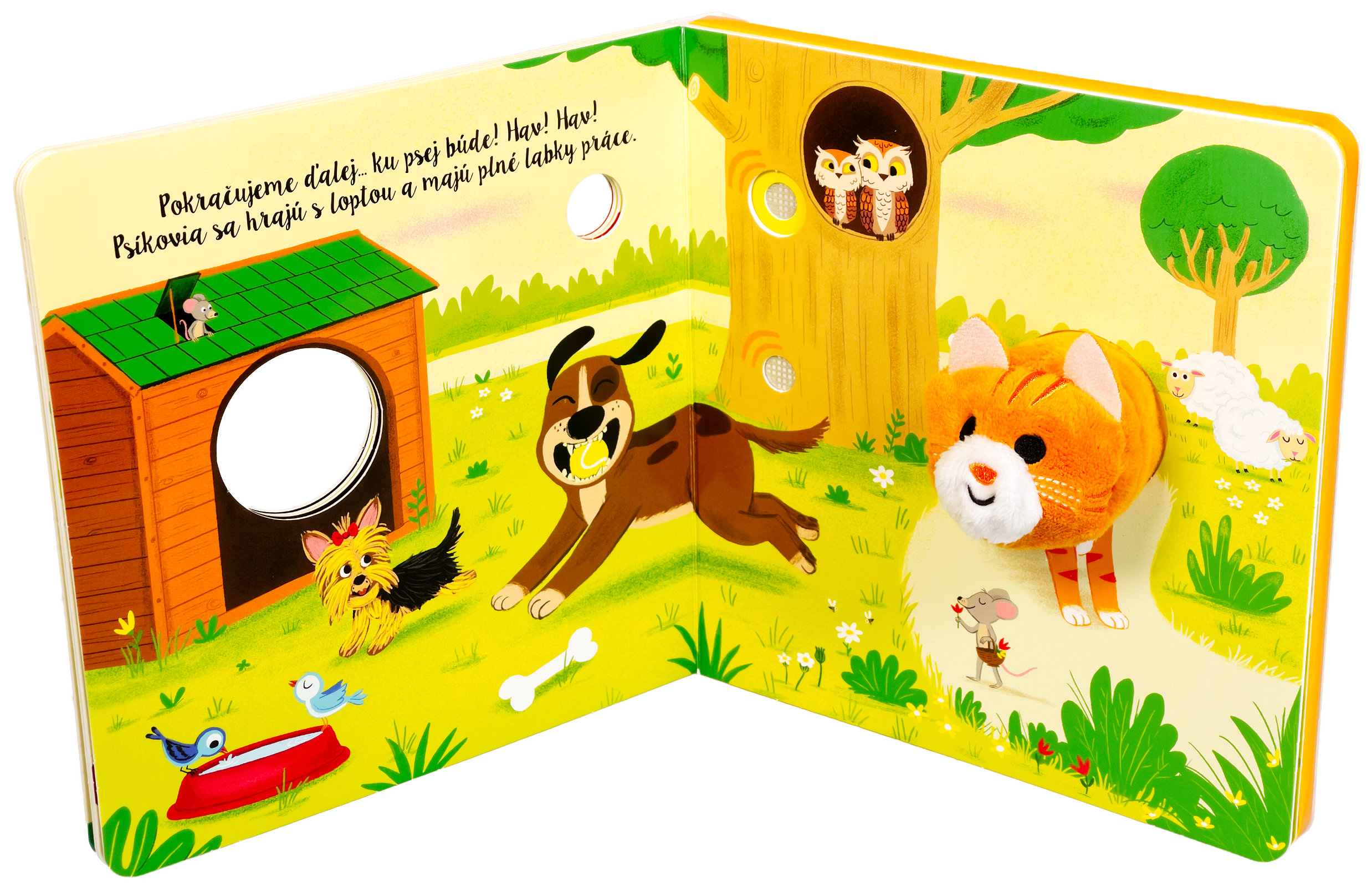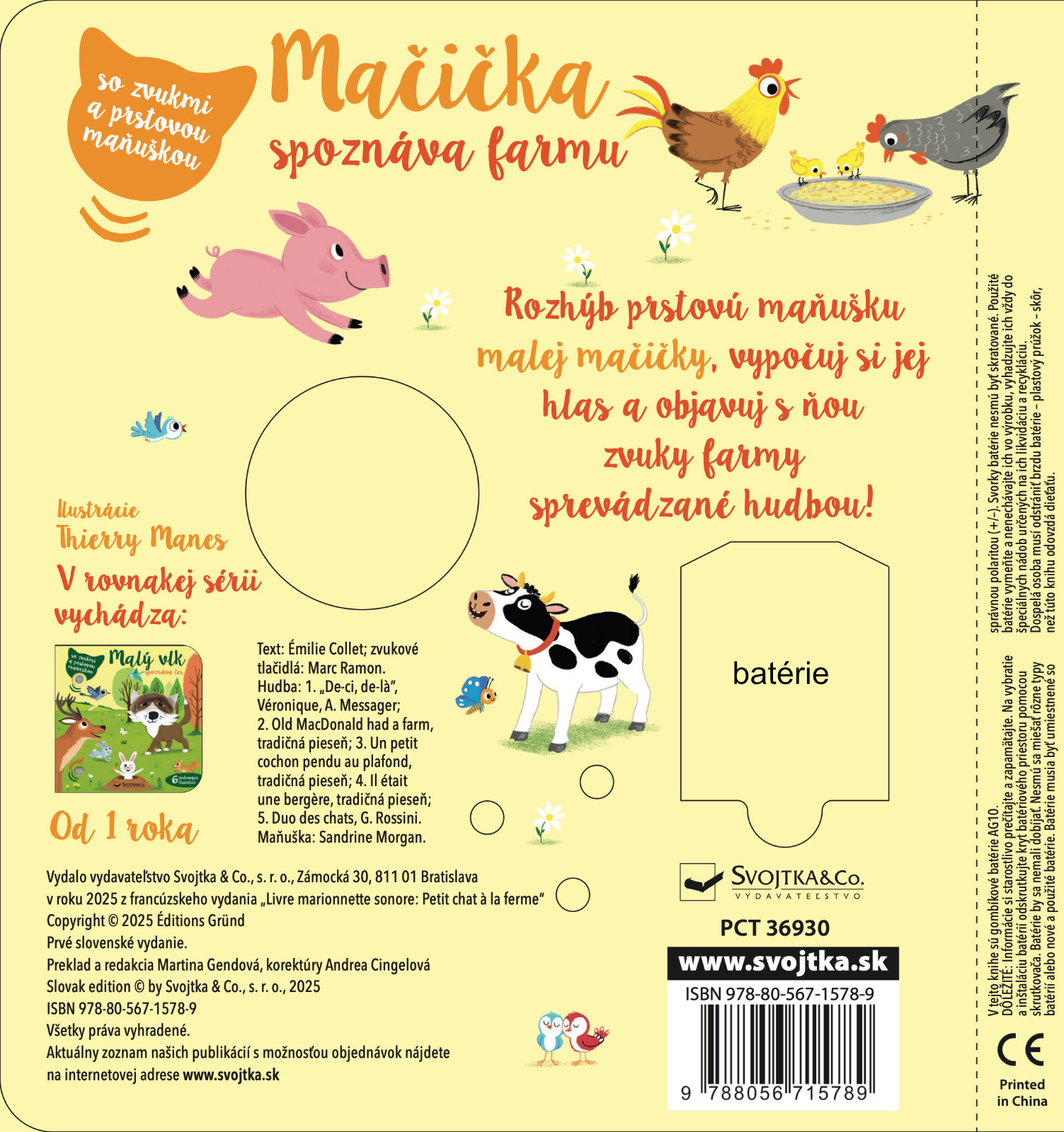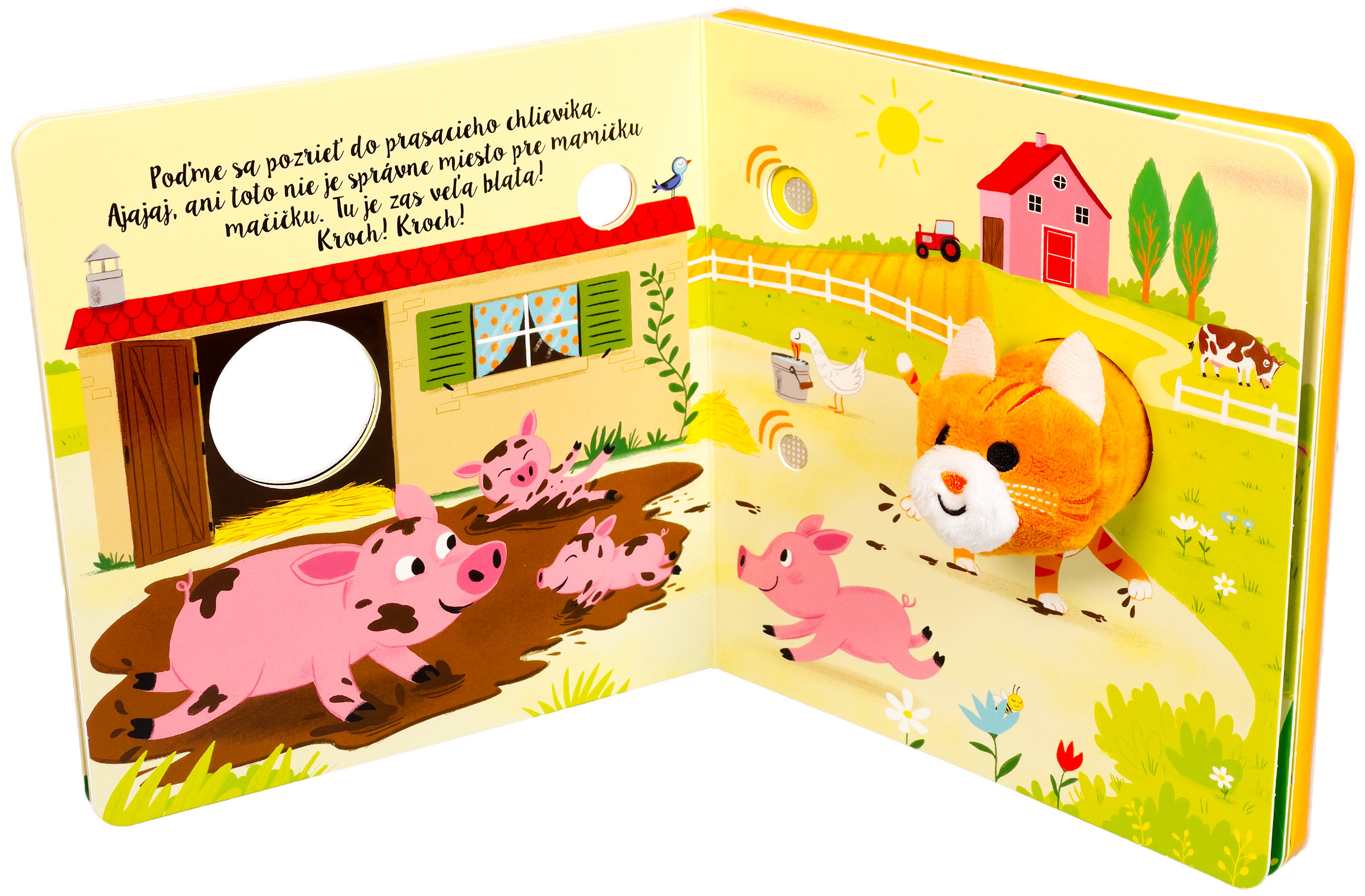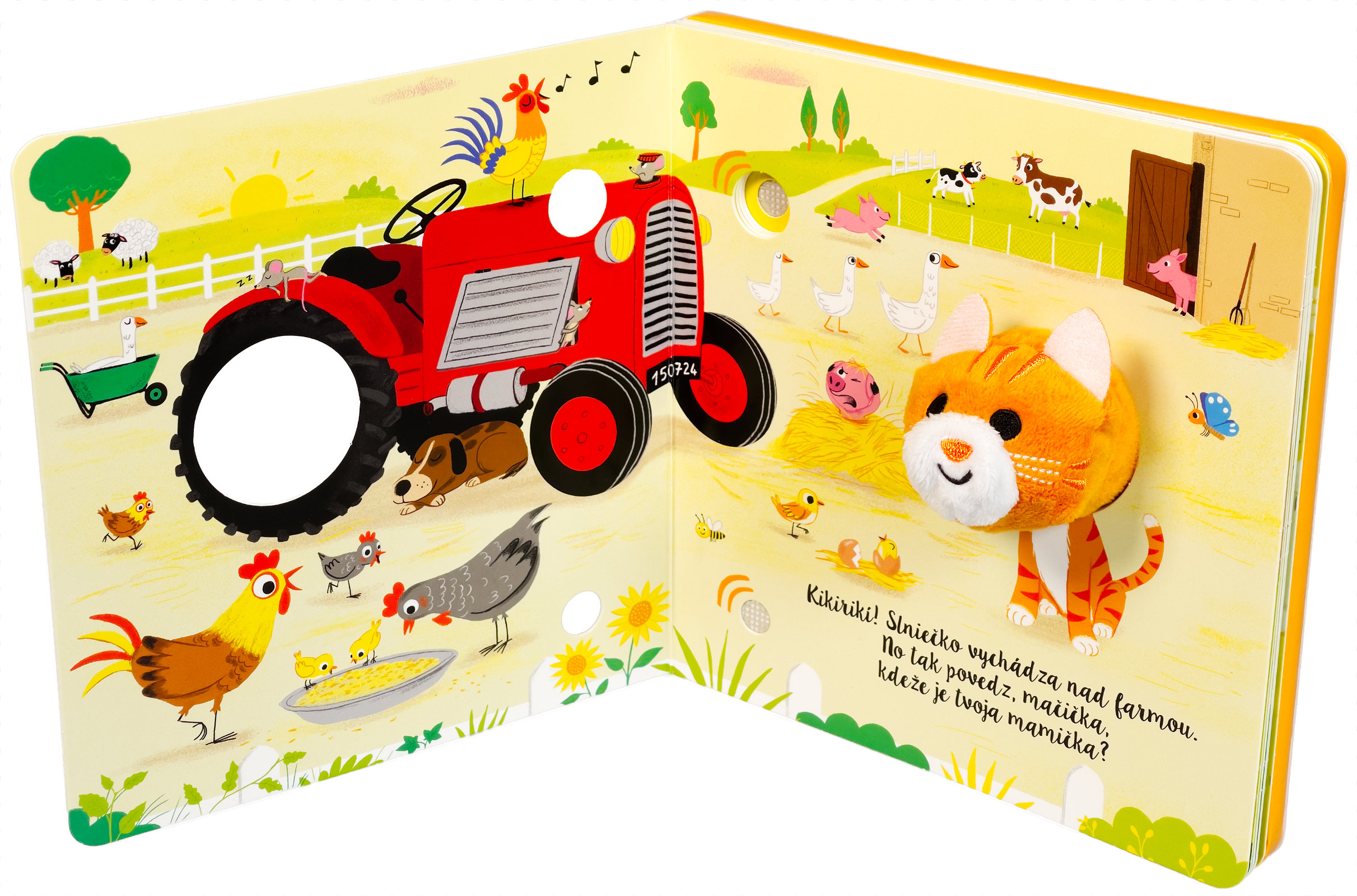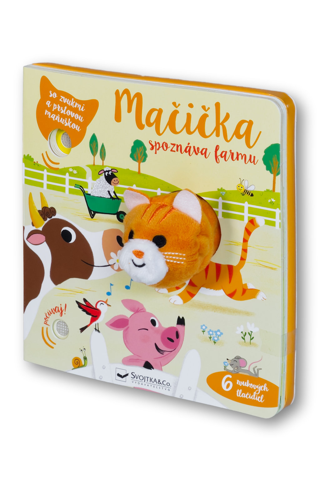 Leporelo s prstovou maňuškou a 6 zvukovými tlačidlami. Kamže sa podela mamička malej mačičky. Poďme ju s mačičkou nájsť a pritom preskúmame celú farmu. Kde môže byť? Pred chlievikom pri prasiatkach, alebo na pastvine s kravičkou. Vypočujte si s vašimi malými farmármi a farmárkami zvuky hospodárskych zvierat, sprevádzané jemnou hudbou. Vyskúšajte, čo sa stane, keď stlačíte zvukové tlačidlo. Ktože to mňauká? Roztomilá maňuška sa môže vďaka prštekom pohybovať a báječne tak oživuje príbeh z farmy.Počet strán: 10