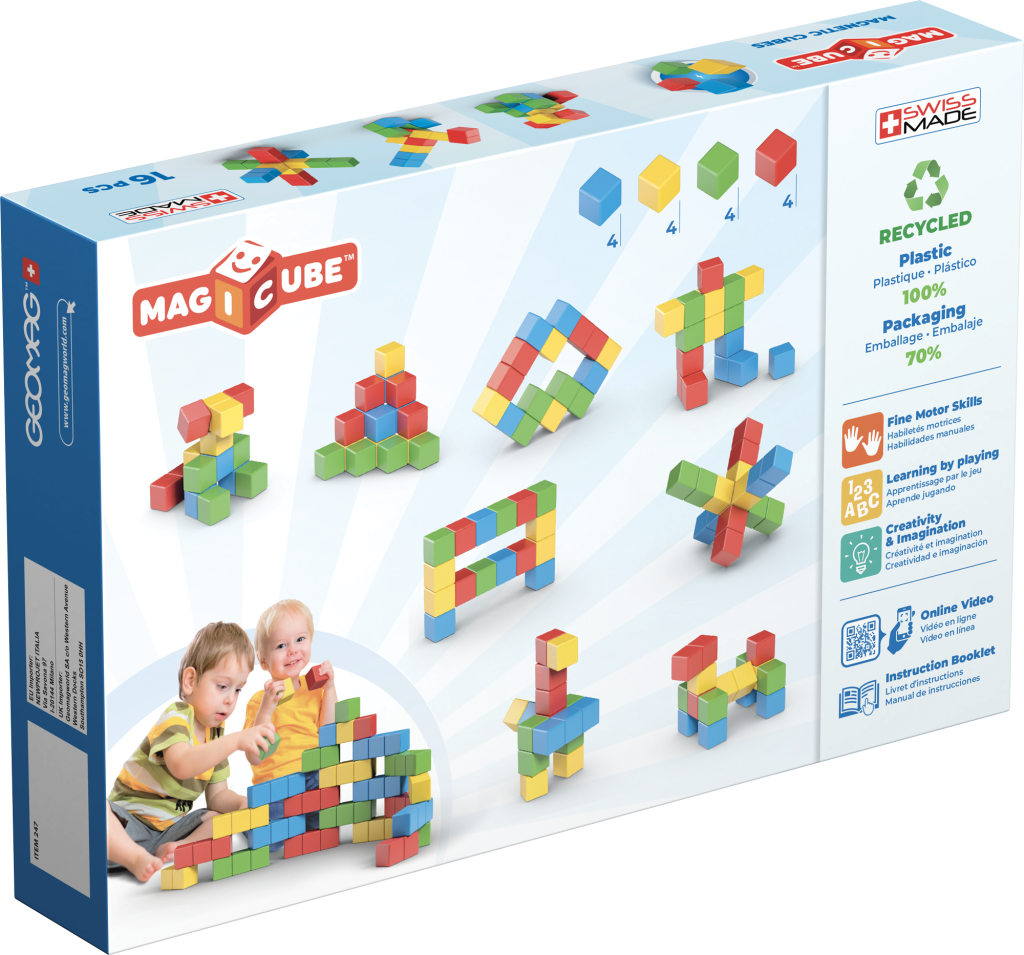 Díky speciální vnitřní konstrukci se magnetické kostičky přitahují ze všech šesti stran a drží i volně v prostoru - stavění ve 3D. Obsahuje 16 kostek ve čtyřech barvách. Vhodné od 1 roku.