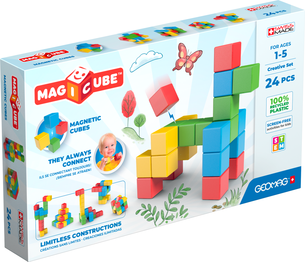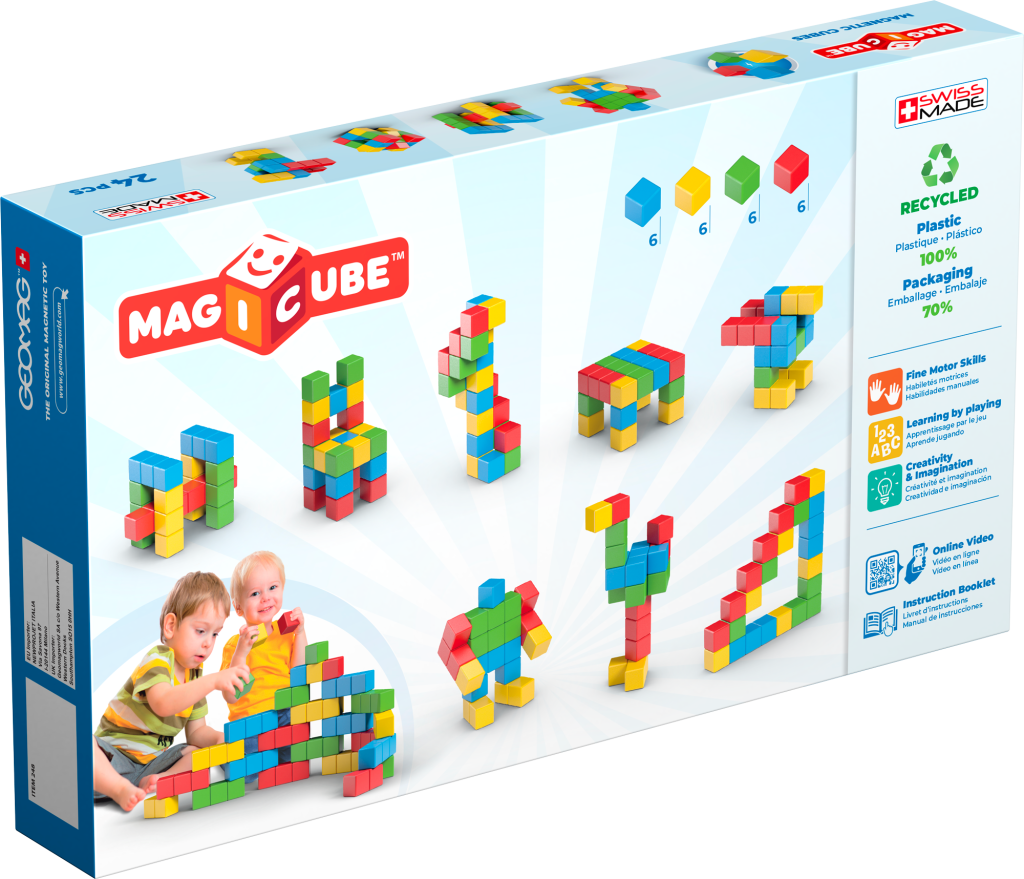 Díky speciální vnitřní konstrukci se magnetické kostičky přitahují ze všech šesti stran a drží i volně v prostoru - stavění ve 3D. Obsahuje 24 kostek ve čtyřech barvách. Vhodné od 1 roku.
