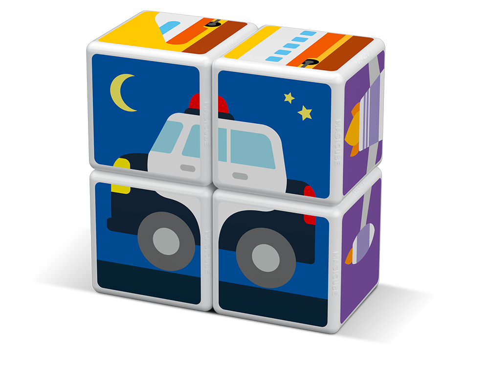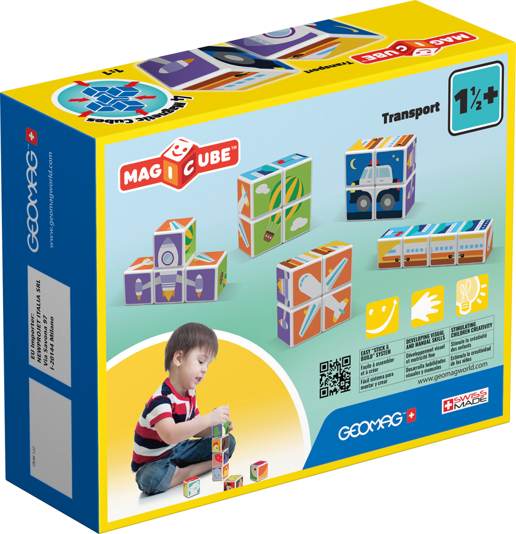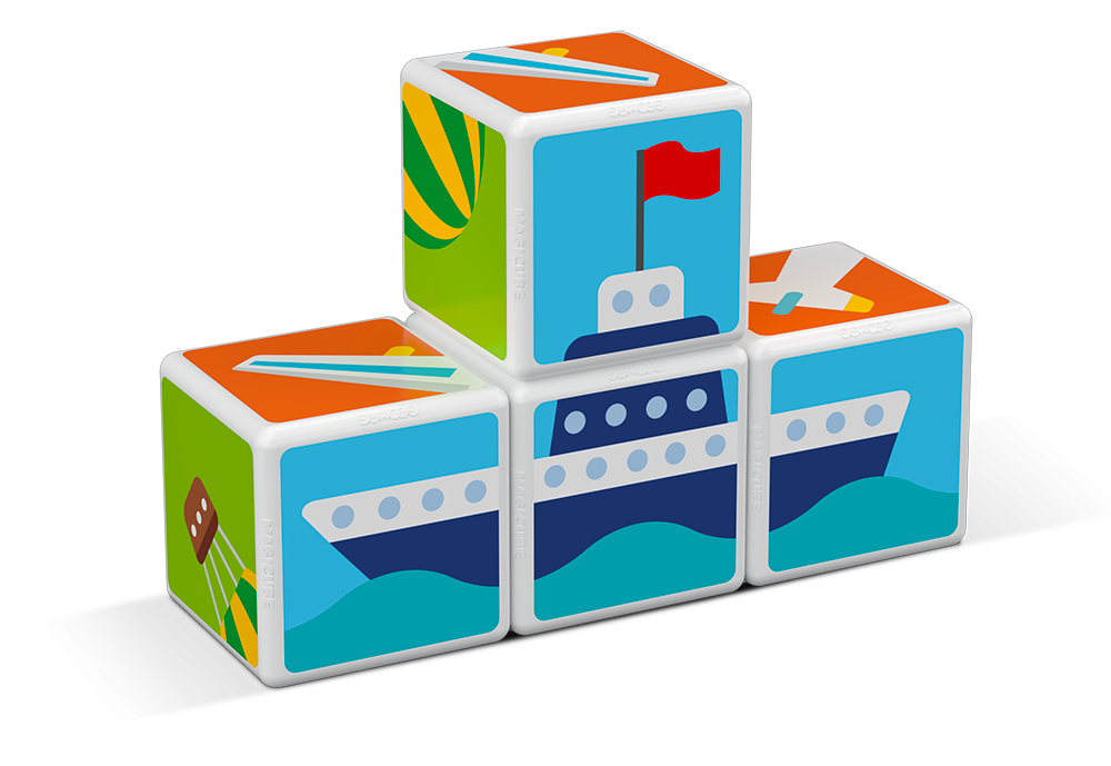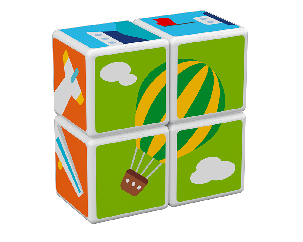 Výlet letadlem, vlakem nebo snad kosmickou raketou? Stačí si vybrat. Jednoduché spojování a otáčení zvládnou i ti nejmenší. Díky magnetkům uvnitř kostek krásně drží v prostoru, stavění ve 3D!!! Obsahuje 4 magnetické kostičky a 6 tipů na skládání (3 kartičky). Určeno pro děti od 1,5 roku.