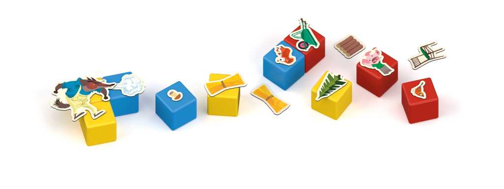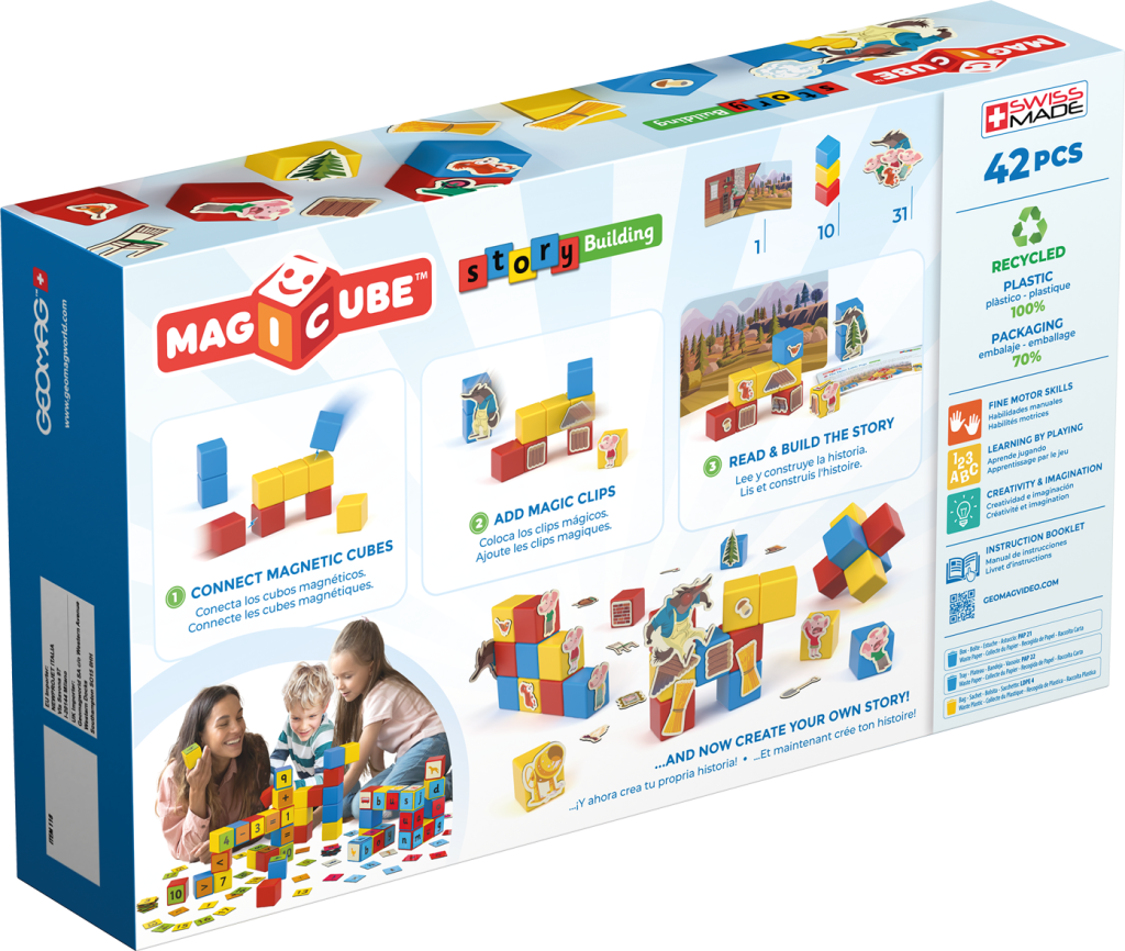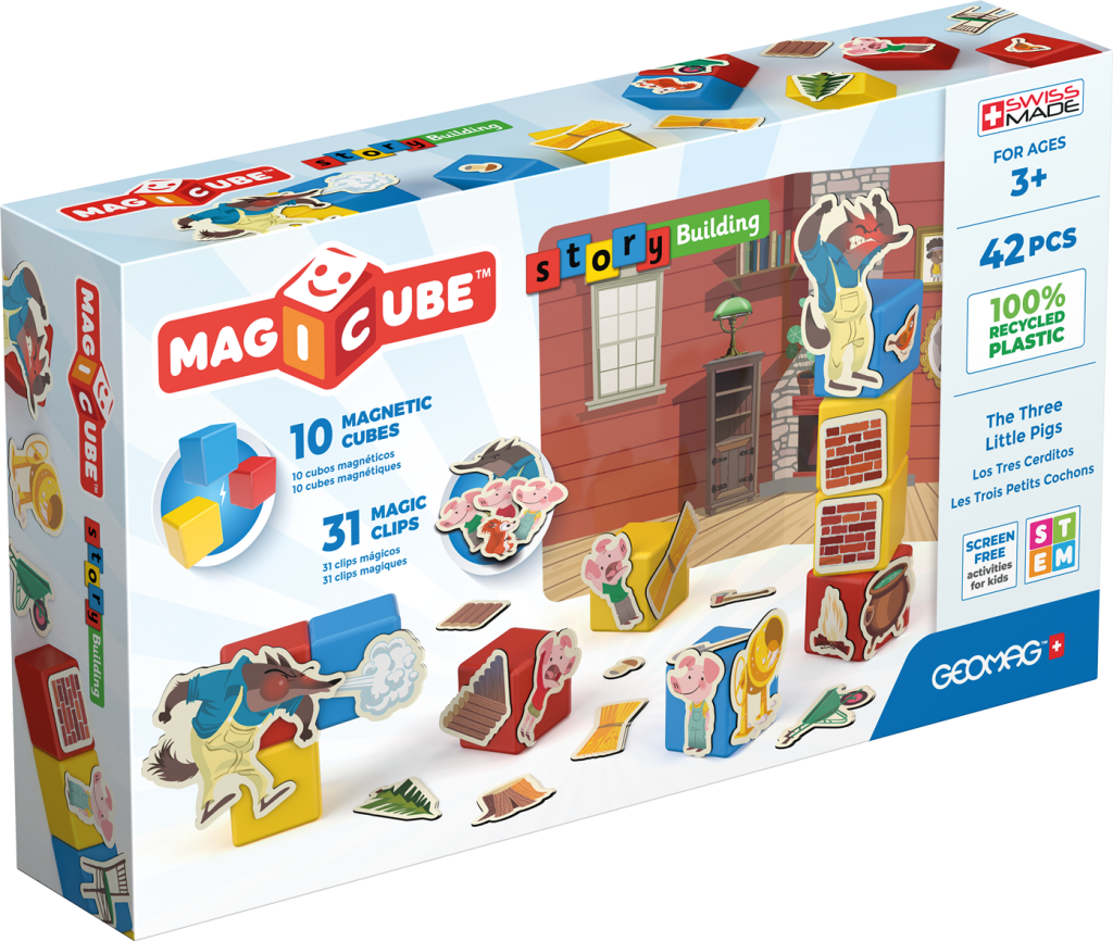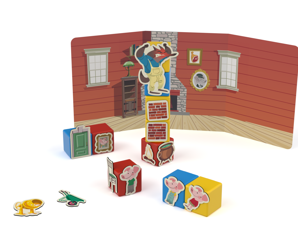 Rodiče čtou pohádku O třech malých prasátkách a děti ji přikládáním klipů k magnetickým kostičkám sami vytváří. Nebo můžete vymýšlet pohádky vlastní. Součástí je text v češtině a slovenštině. Obsahuje 10 magnetických kostek, 31 klipů s obrázky a oboustrannou kartu s motivem domu a lesa. Vyrobeno ze 100% recyklovaného materiálu. Vhodné pro děti od 3 let.