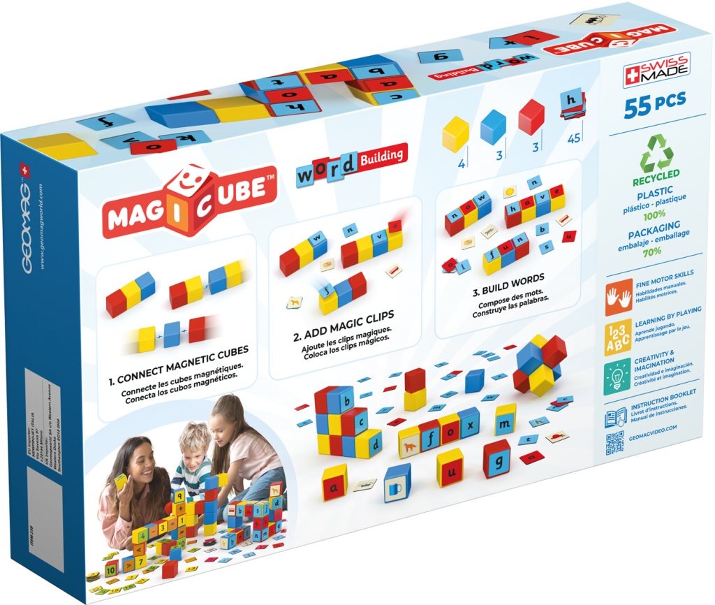 Vyzkoušejte domácí školu hrou s kostkami Geomag a pozorujte, jak se Vaše ratolest učí, začíná rozlišovat písmena, vytváří první slova a skládá je pomocí obrázků. Děti mají možnost vytvářet různé tvary, barevné kombinace a 3D struktury díky Geomag Magicube, které jsou jedinečné v tom, že se přitahují a spojují ze všech stran. Sada obsahuje 10 magnetických kostiček ze 100% recyklovaného plastu a 45 klipů. Barevně jsou odlišeny samohlásky a souhlásky, klipy jsou oboustranné. Stavebnice pomáhá při rozvoji kreativity, jemné motoriky a pomocí hry s písmeny a obrázky stimuluje zvědavost, hledání řešení a zkoumání systému magnetismu. Vhodné pro děti od 3 let.