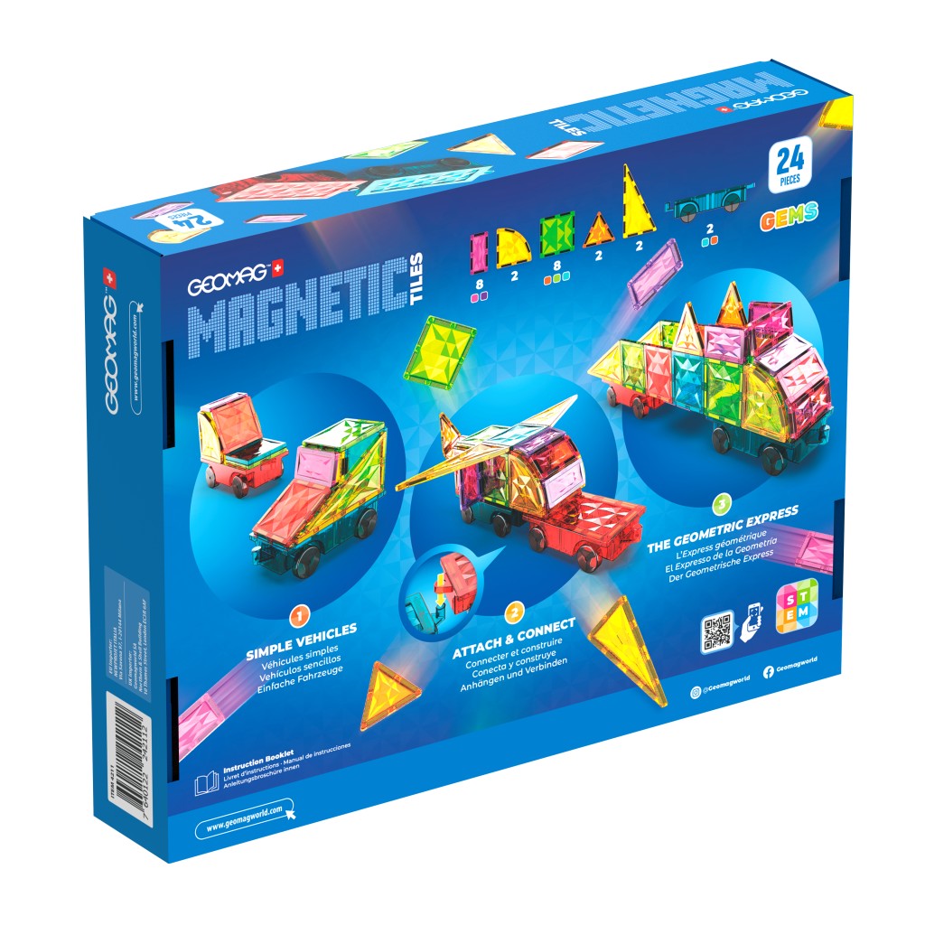 Dílky Geomag Magnetic Tiles Auta obsahují integrované magnety na všech stranách jednotlivých tvarů. Lze tak snadno vytvářet jakékoliv 2D obrazce nebo 3D struktury. Stavebnice rozvíjí manuální zručnost, kreativitu a fantazii, učí barvy, geometrické tvary, ale hlavně si s ní děti užijí spoustu zábavy. Obsahuje 8 čtverců, 2 rovnostranné trojúhelníky, 8 malých obdélníků, 2 dlouhé pravoúhlé trojúhelníky, 2 pravoúhlé čtvrtkruhy, 2 podvozky s nápravami a koly. Vhodné pro děti od 3 let.