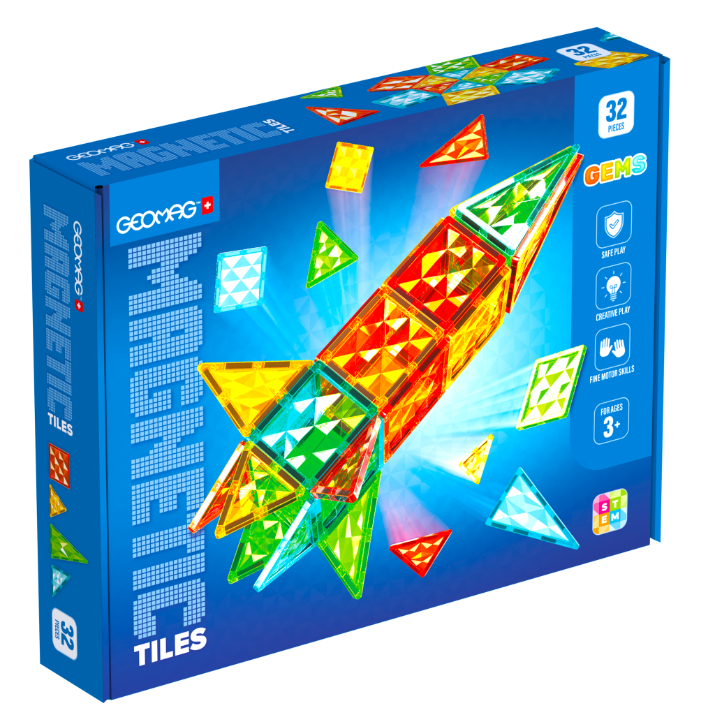 Geomag Magnetic Tiles Raketa 32 dílků obsahuje magnety na všech stranách jednotlivých tvarů. Lze tak snadno vytvářet jakékoliv 2D obrazce nebo 3D struktury. Stavebnice rozvíjí manuální zručnost, kreativitu a fantazii, učí barvy, geometrické tvary, ale hlavně si s ní děti užijí spoustu zábavy. Obsahuje 32 průhledných strukturovaných dílků ve čtyřech barvách – 14 čtverců, 10 rovnostranných trojúhelníků, 4 rovnoramenné trojúhelníky a 4 pravoúhlé trojúhelníky. Vhodné od 3 let.
