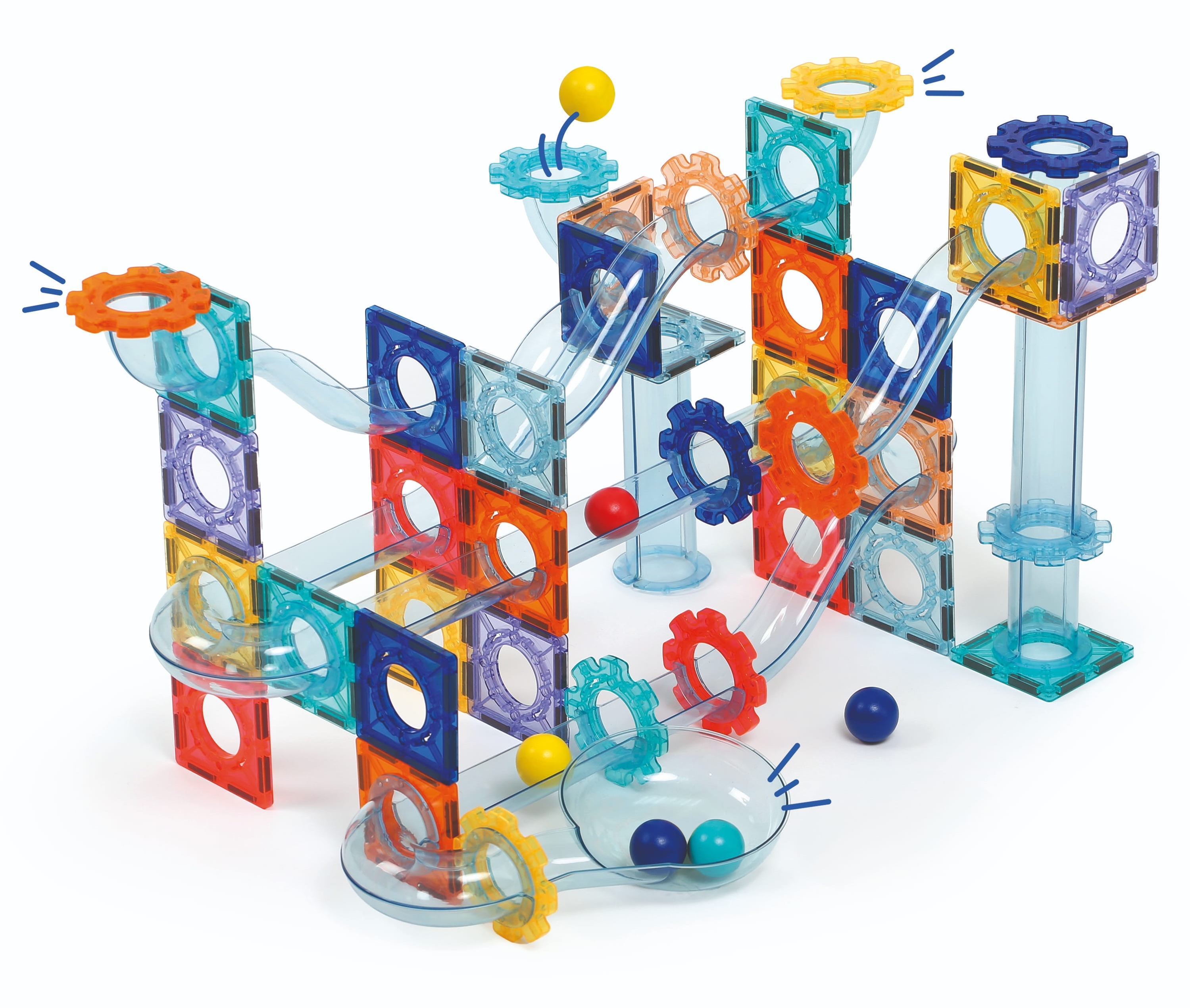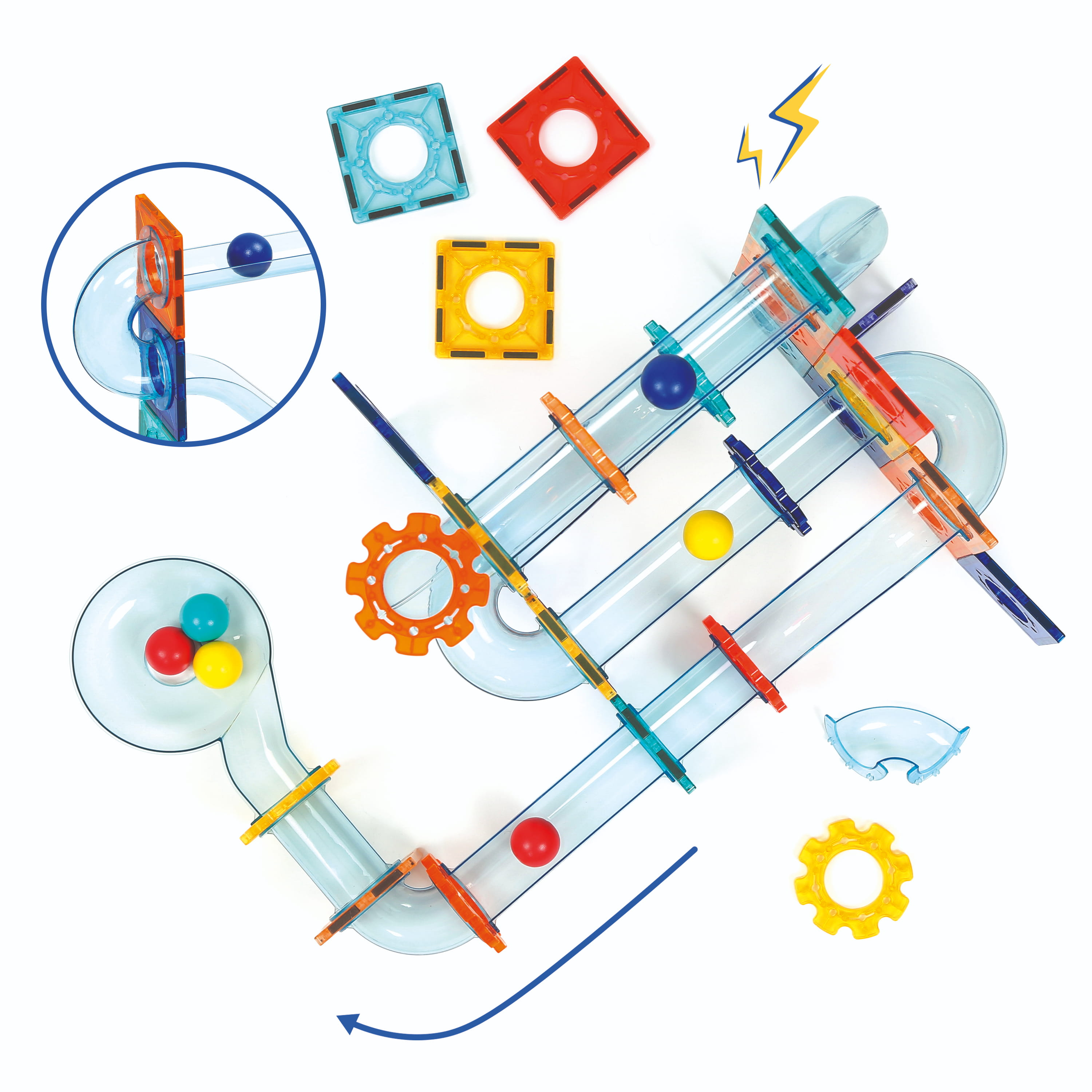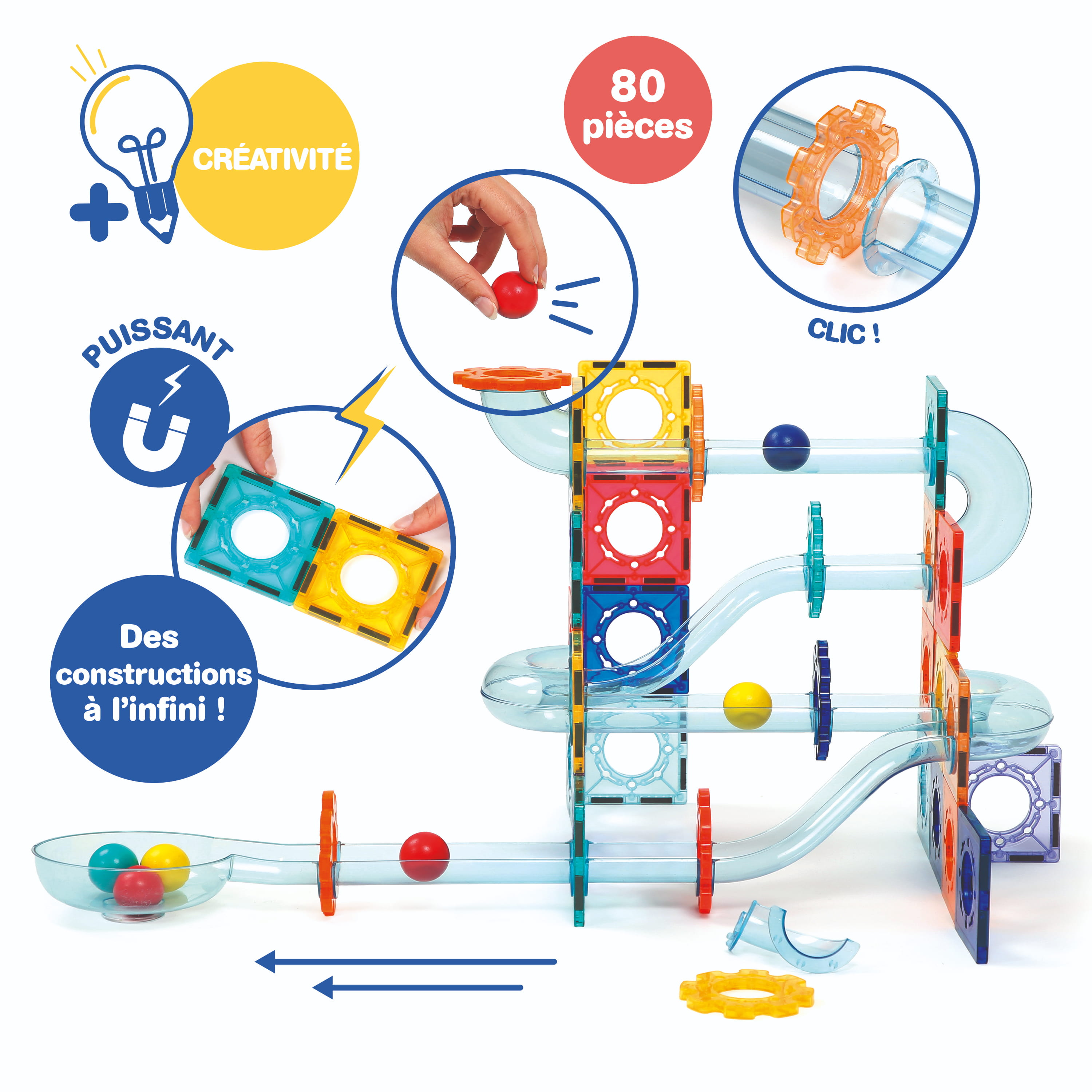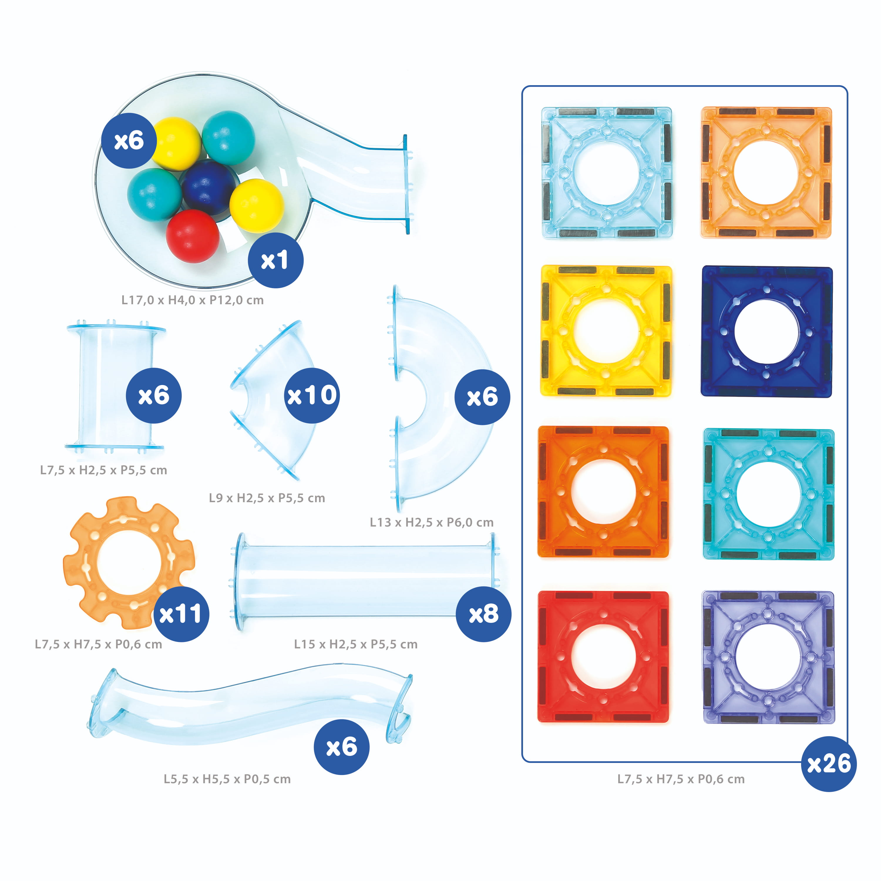 Obsah balení: 26 magnetických destiček, 48 dílů dráhy, 6 kuliček, úložný box
