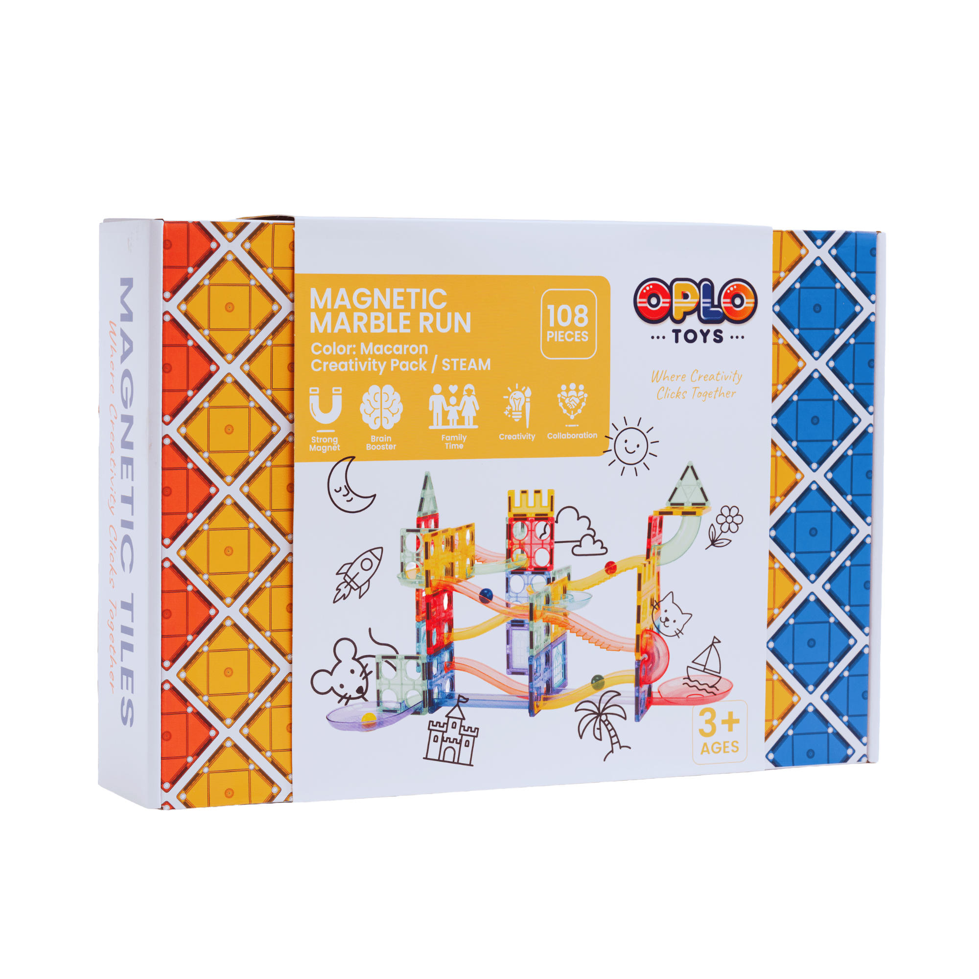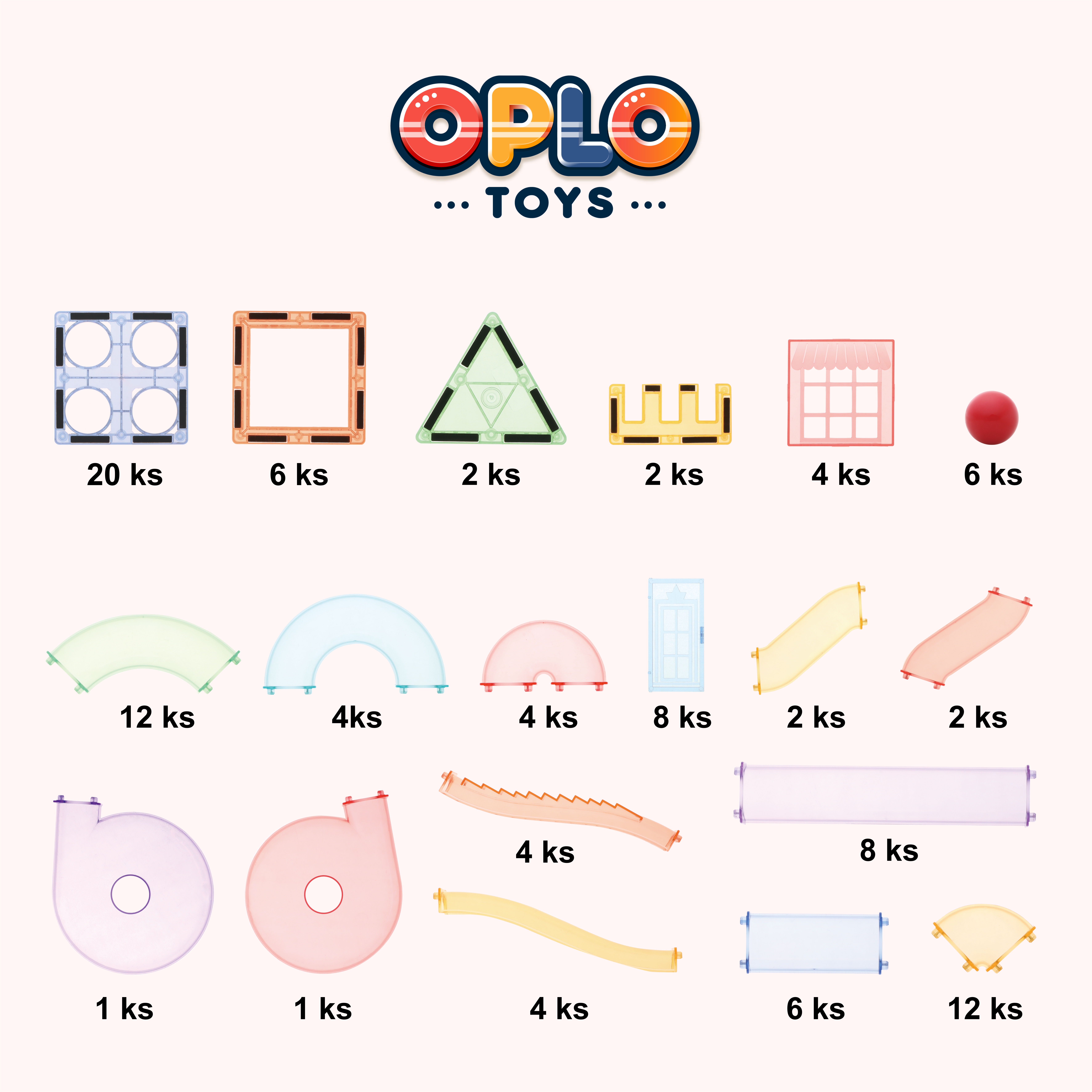 Postav, spoj a sleduj, ako sa guličky kotúľajú po tvojej vlastnej dráhe. Magnetická stavebnica Oplo Toys - Guľôčková dráha Macaron 108 KS prináša jemné pastelové farby, silné magnety a hodiny tvorivej zábavy.