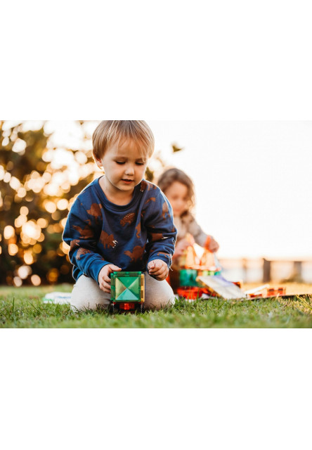 Souprava obsahuje: 2 základny pro auta s gumovými koly 12 x malé čtverečky 8 x obdélníkové dílky 2 x dílky dveří 1 x brožura s nápady