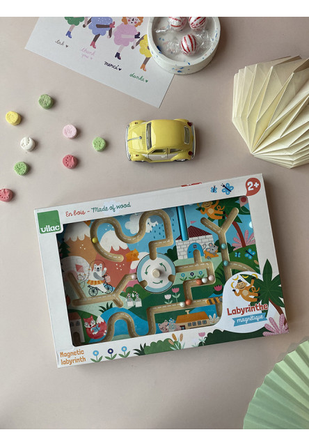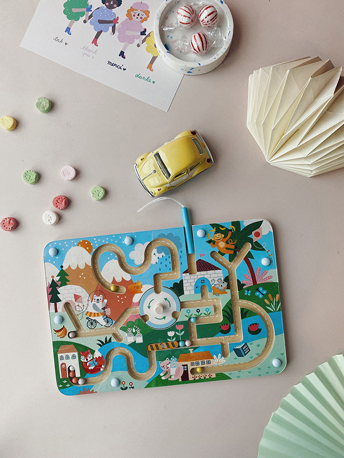 Uveďte deti do poetického sveta s ilustráciami Michelle Carlslundovej. Pomocou magnetického pera sa môžu pokúšať prihrať jednotlivým zvieratkám ich guličky. Dostane pán kocúr svoje mlieko, biele guličky? Rozverná opička svoje banány, žlté guličky? Komupak rozdať guličky ostatných farieb, priateľskému medvedíkovi, chytrej líške, alebo vrtkej myške? Na ceste čaká množstvo prekážok a nástrah, ktoré môžu deti prekonávať pomocou svojho dôvtipu. Zábavnou formou takto môžu trénovať jemnú motoriku alebo orientáciu v priestore. Pri snahe pomenovať vyobrazené zvieratká i deje a pochopiť súvislosti medzi nimi možno tiež rozvíjať poznávacie schopnosti. Hlavné vlastnosti:bludisko a magnetické perozábavné aj bezpečné vďaka magnetickému princípudizajn Michelle Carlslund Cestujte s nami v naivnom a elegantnom svete dánskej ilustrátorky Michelle Carlslund, svete jemných farieb, ktorý je plný roztomilých medveďov a priateľských vtáčikov. V roku 2010, keď Michelle ešte študovala grafický dizajn, vytlačila doma svoje ilustrácie a skúsila ich predať na dizajnovom trhu, kde sa stretli s veľkým úspechom! Niekoľko obchodíkov chcelo začať predávať jej výtvory, a tak ju napadlo, že by bolo fajn začať podnikať. Michelle sa rýchlo stala uznávanou nezávislou ilustrátorkou. Dnes možno jej ekologické grafické diela zakúpiť po celom svete v dizajnových butikoch, papiernictvách a detských obchodoch. Michelle sa inšpiruje všetkým okolo nej. Jej výtvory sú nežné a poetické, štylizovaný a detinský štýl, ktorý sa perfektne prelína s hračkami firmy Vilac. „Som hranolky milujúca, časová optimistka a tvorkyňa ekologických plagátov a ilustrátorka na voľnej nohe so sídlom v dánskej Kodani,“ to by povedala ilustrátorka Michelle Carlslundová, keby sa mala popísať jednou vetou.