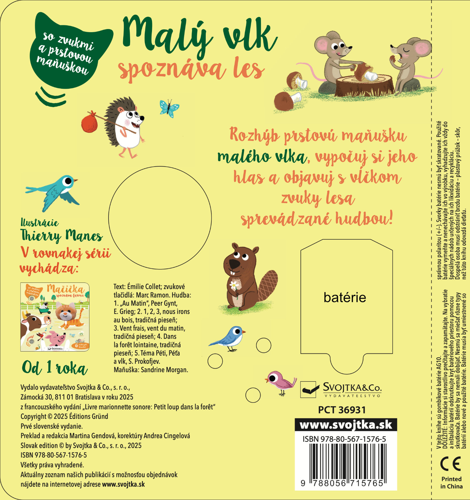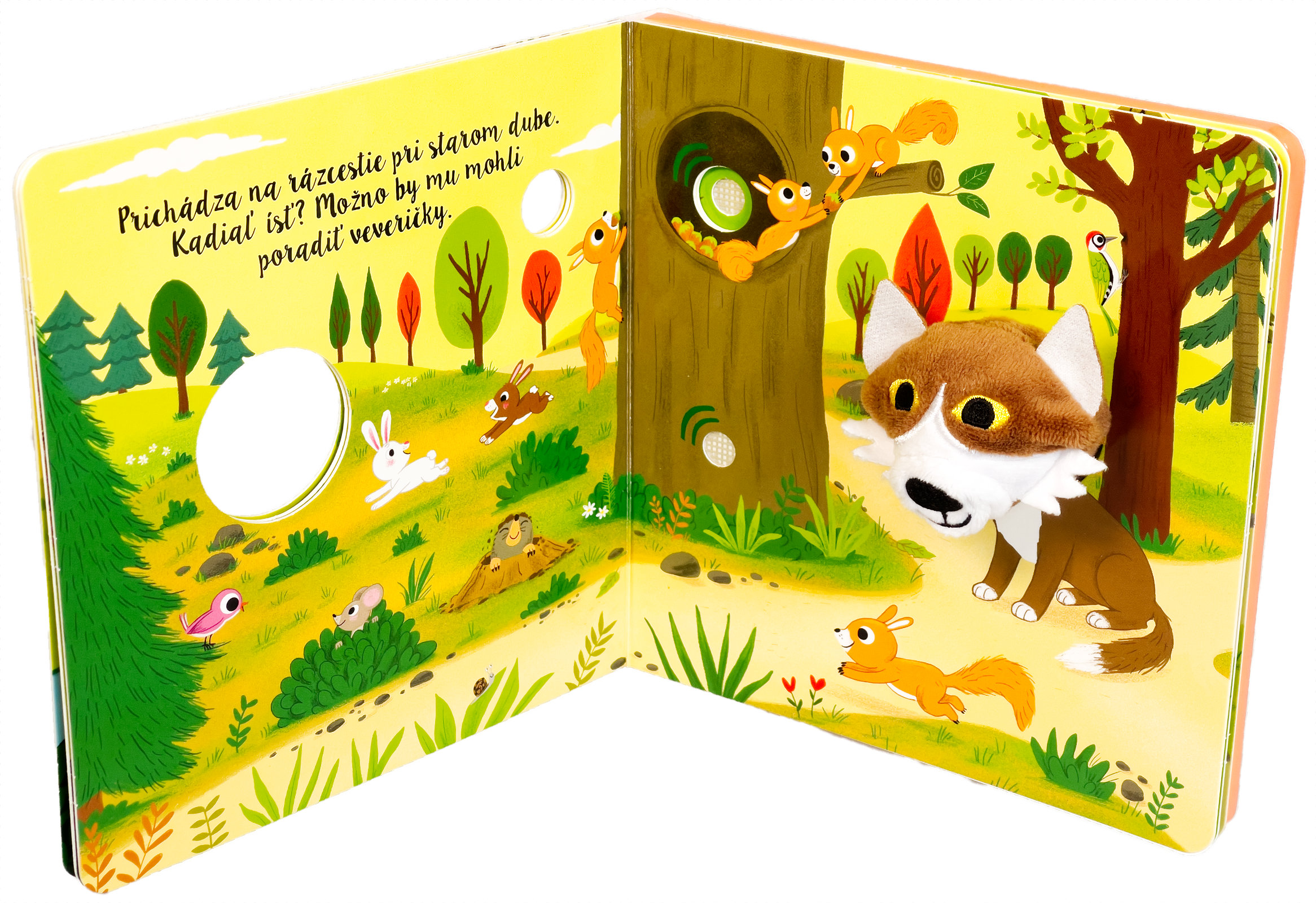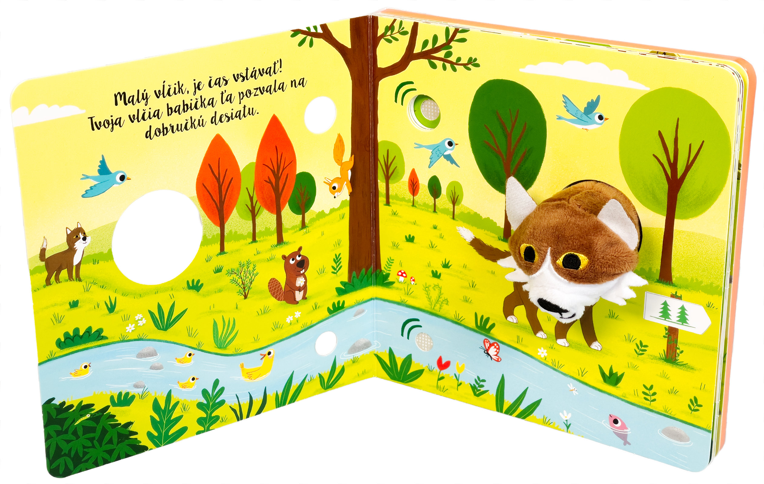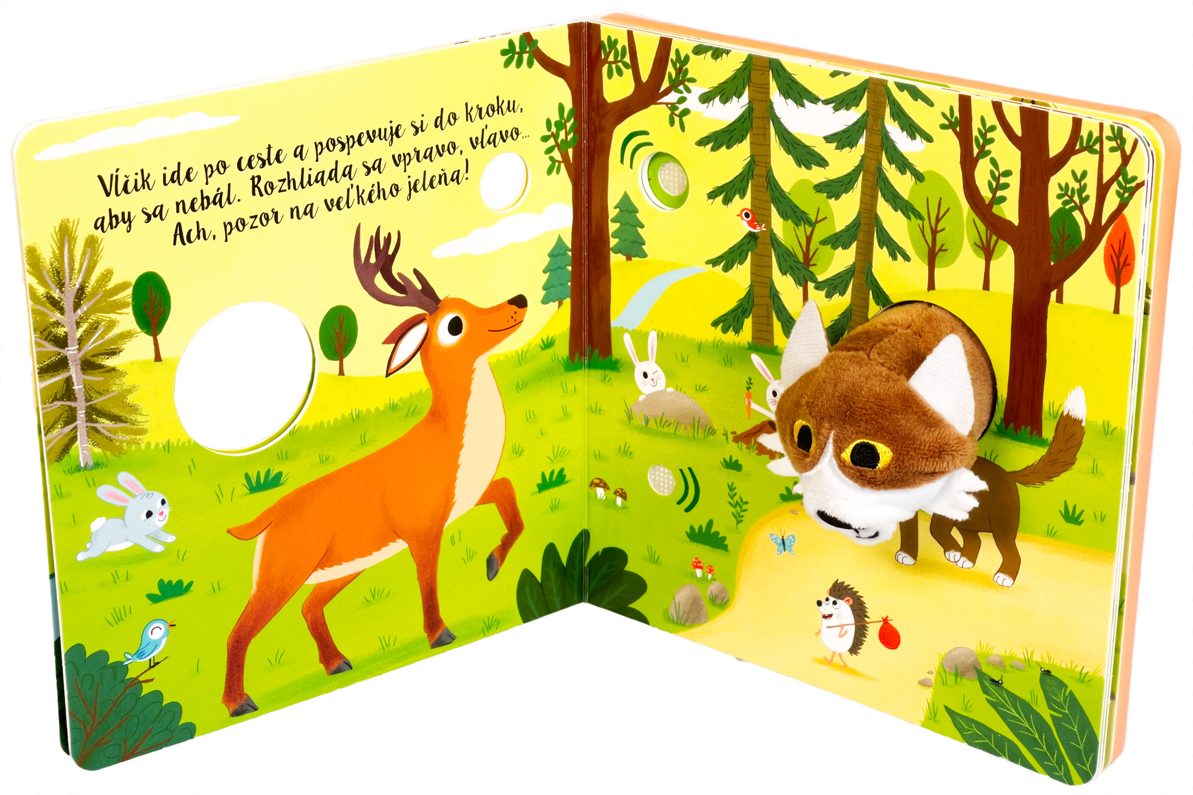 Leporelo s prstovou maňuškou a 6 zvukovými tlačidlami. Malý vlk sa vydáva na dobrodružnú cestu lesom, aby našiel svoju vlčiu babičku, ktorá má pre neho nachystanú dobručkú desiatu. Kade sa má vydať? Možno poradia veveričky pri dube, alebo správnu cestu ukážu kukučky. Pri objavovaní lesa budú deti počuť zvuky jeho zvieracích obyvateľov, sprevádzané jemnou hudbou. Čo sa stane, keď stlačíte tlačidlo? Roztomilý vĺčik zavyje a môže sa aj pohybovať vďaka prstovej maňuške, ktorá báječne oživuje tento okúzľujúci príbeh z prírody.Počet strán: 10