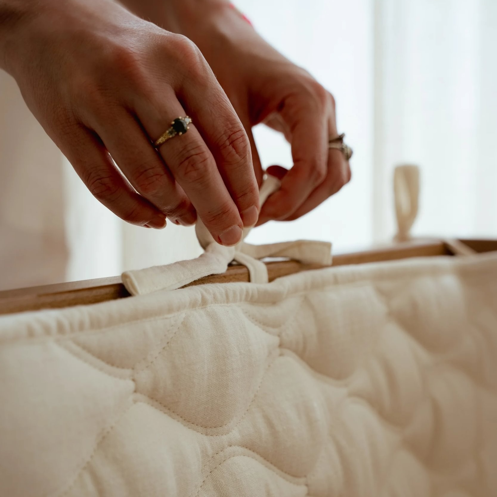 - Snadné uchycení - praktické šňůrky umožňují jednoduché a pevné přivázání k bočnicím postýlky