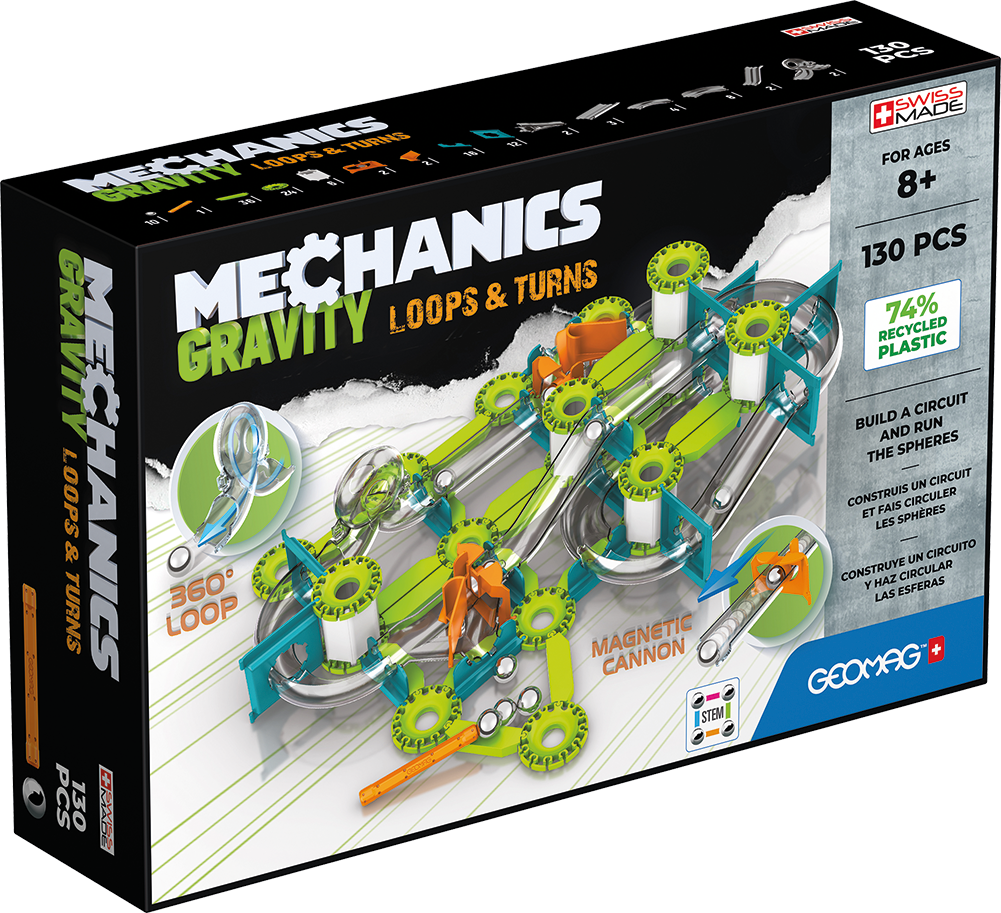 Geomag Mechanics Gravity 130 dílků je stavebnice určená pro děti od 8 let, která kombinuje principy gravitace a magnetismu, aby vytvořila dynamickou a zábavnou konstrukci. Sada obsahuje celkem 130 dílků, které umožňují sestavit složitý okruh s různými smyčkami a zatáčkami, po kterých se pohybují kovové kuličky. Díky průhledným drahám a barevným komponentům v odstínech zelené, modré a oranžové je možné sledovat celou cestu kuliček a jejich interakci s jednotlivými částmi stavebnice.