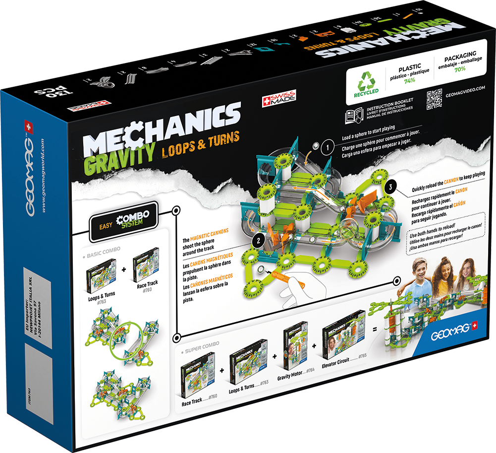 Součástí stavebnice jsou také magnetické děla, která slouží k odpalování kuliček, což přidává další vrstvu zábavy a umožňuje udržet řetězovou reakci v pohybu. Konstrukce obsahuje několik 360° smyček, které zvyšují dynamiku pohybu kuliček a dělají hru ještě atraktivnější. Díky systému EASY COMBO lze tuto sadu snadno kombinovat s dalšími stavebnicemi z řady Gravity, což umožňuje rozšiřovat a propojovat různé modely a vytvářet tak ještě složitější dráhy.