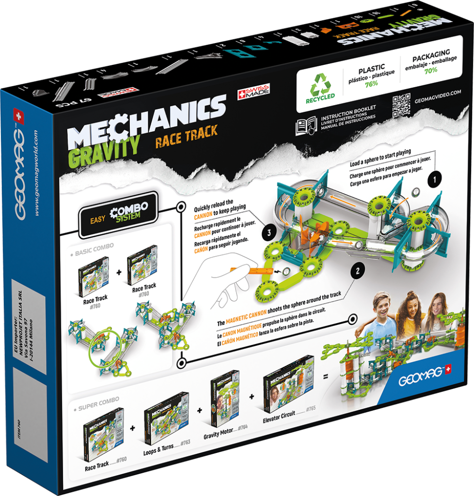 Geomag Mechanics Gravity Race Track je stavebnice o 67 dílcích, která umožňuje dětem od 8 let objevovat fascinující svět fyzikálních zákonů prostřednictvím interaktivní hry s magnetickými silami. Tento model umožňuje sestavit funkční dráhu, po které mohou obíhat ocelové kuličky. Díky průhledným drahám a obloukům spolu s výraznými barevnými prvky ve světle zelené, modré a oranžové barvě je konstrukce nejen atraktivní, ale také dobře přehledná, což usnadňuje pochopení principů pohybu a gravitace.
