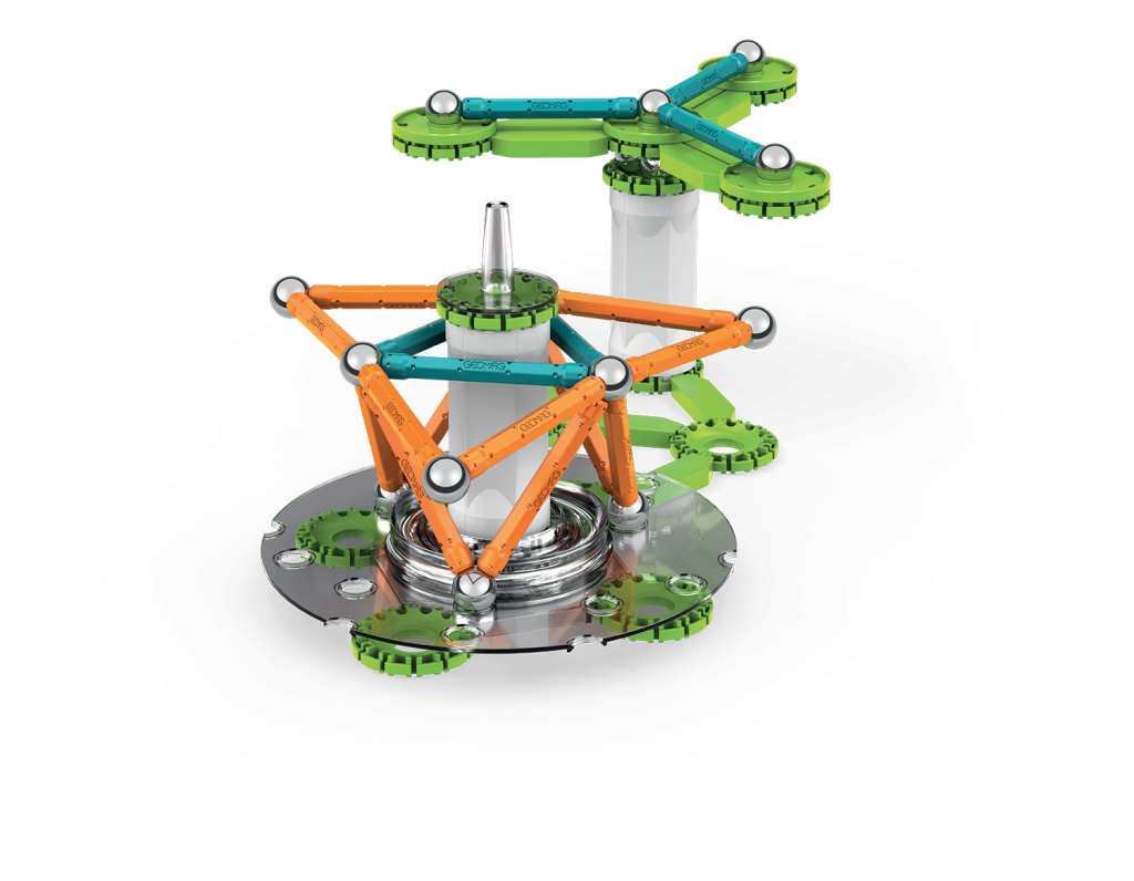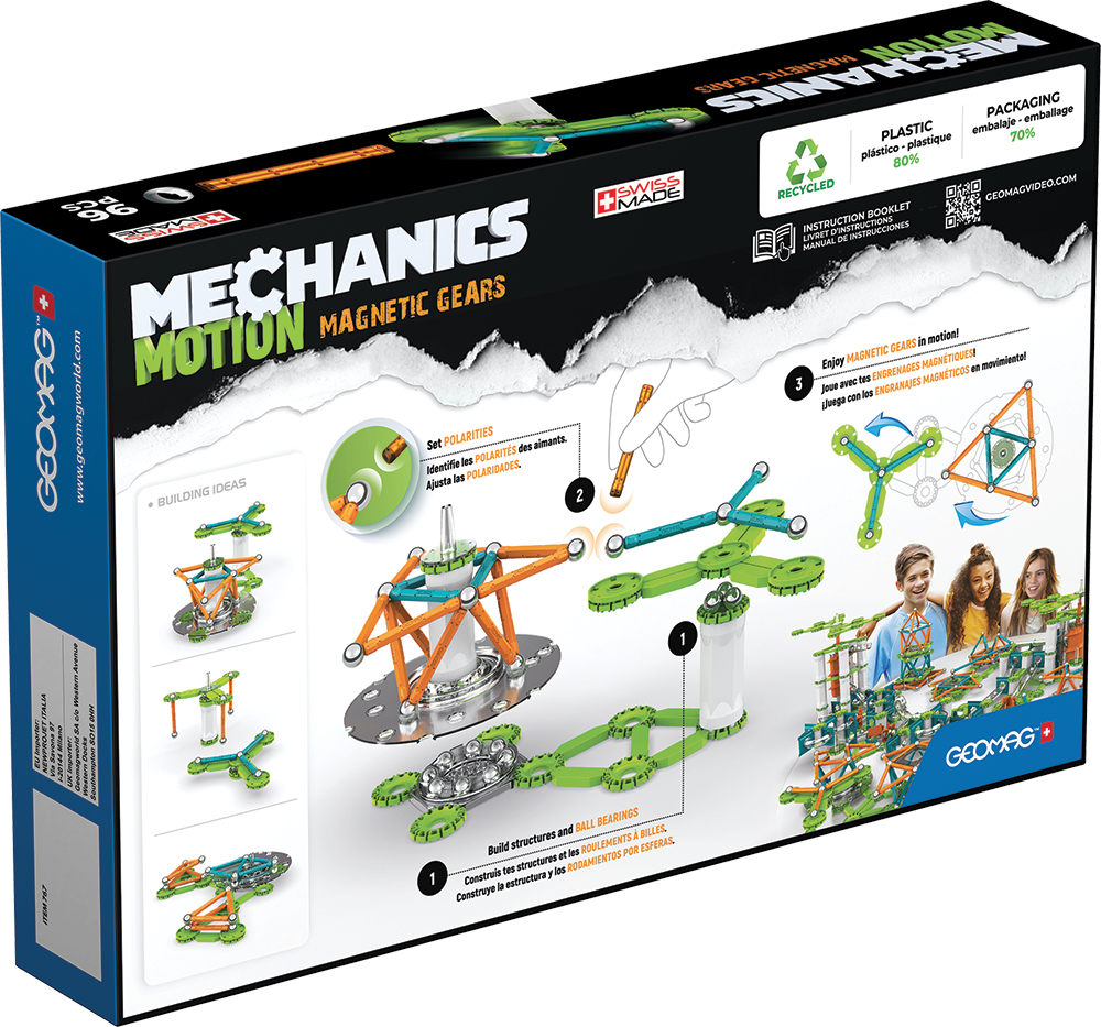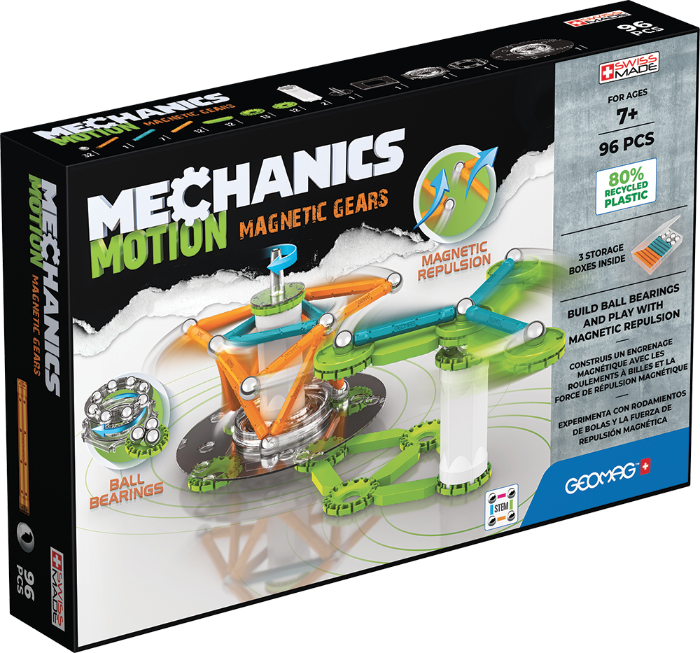 Postavte si úžasné stavby Geomag, kdy k jejich pohybu využijete kuličky jako ložiska spolu s neviditelnými silami magnetů. Stačí správně napólovat magnetické tyčky a celá rozpohybovaná stavba ihned vykouzlí úsměv na vaší tváři. Zkoumejte a pozorujte sílu magnetismu, setrvačnosti a odhalte všechny tajemství zákonů mechaniky. Stavebnice obsahuje 96 dílků. Vhodné pro děti od 7 let. Všechny barevné plastové části stavebnice jsou z recyklovaného plastu.