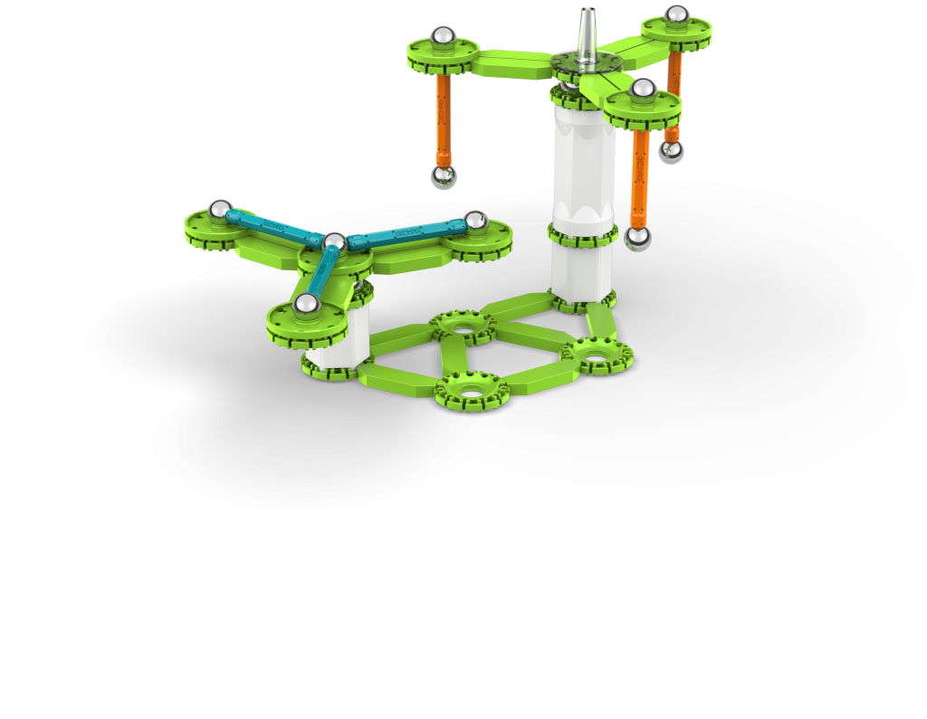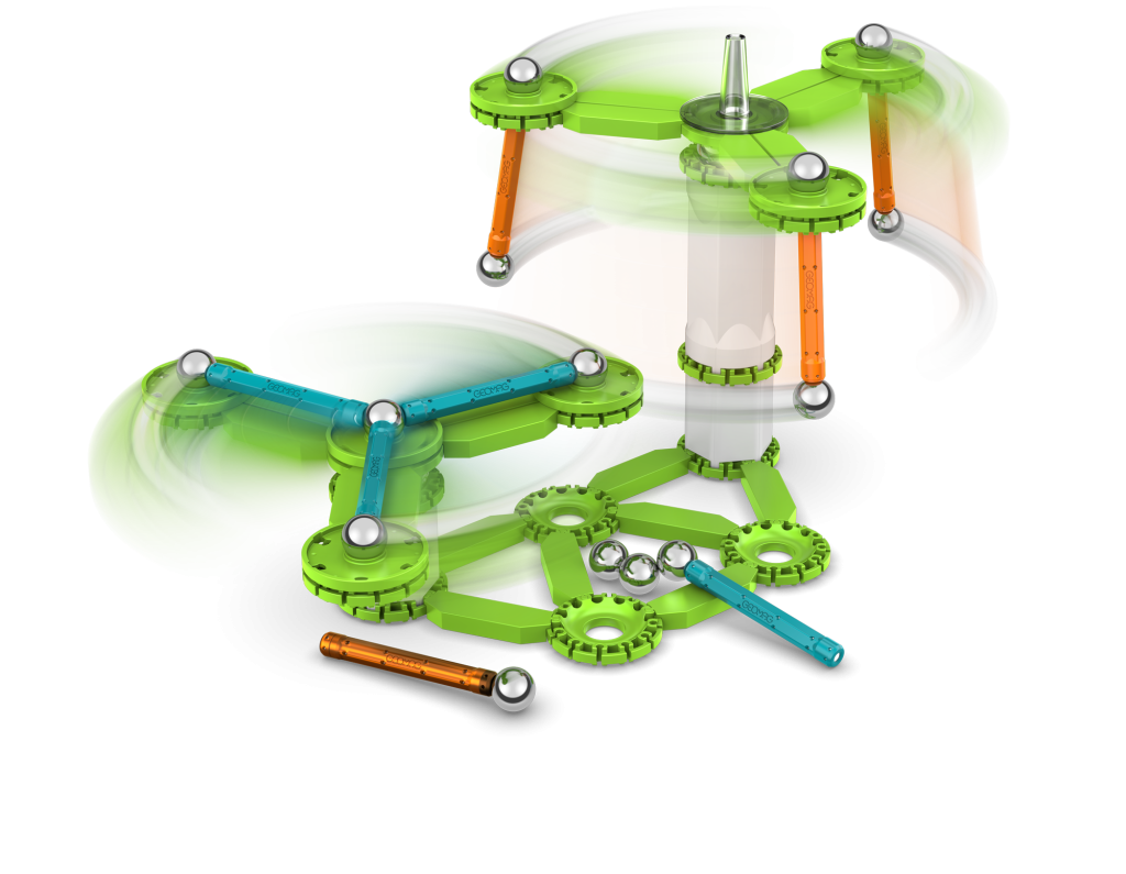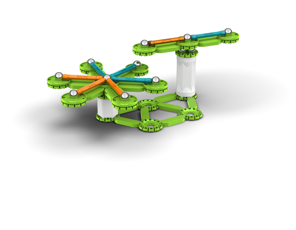 Součástí stavebnice jsou magnetické tyčky v různých barvách – modré a oranžové – a zelené základní dílce, které slouží jako nosné a spojovací prvky. Kuličky, které fungují jako ložiska, jsou kovové a jejich použití umožňuje hladký a efektivní pohyb součástek. Díky kombinaci těchto prvků lze sestavit různé mechanismy s otáčivými částmi a převody, které demonstrují principy magnetické síly a mechanického pohybu.