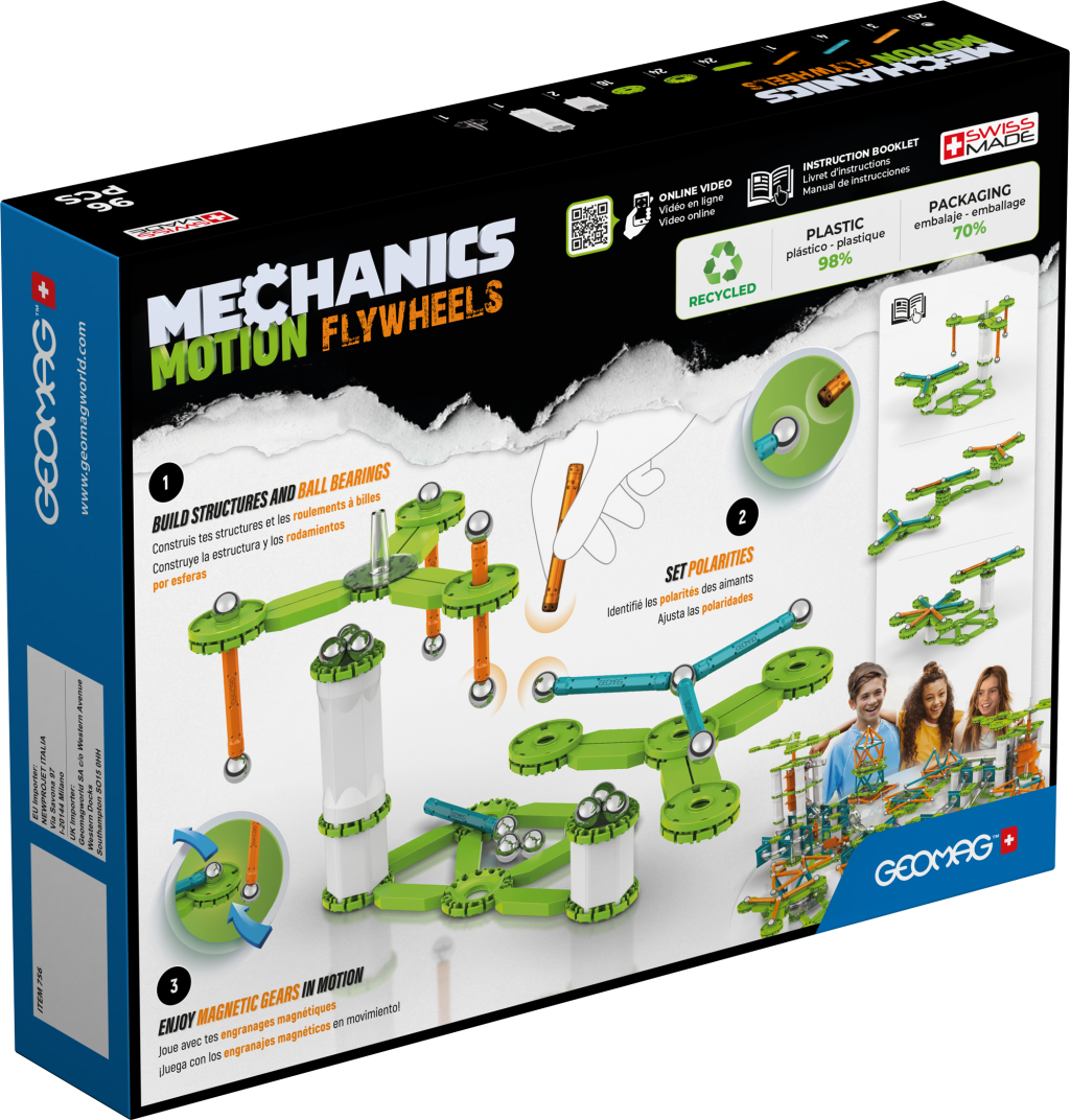 Geomag Mechanics Motion Flywheels je stavebnice obsahující 96 dílků, která umožňuje sestavit různé struktury s využitím kuliček jako ložisek. Díky magnetickým tyčkám s přesně nastaveným napólováním se sestavené modely dokážou roztočit samy bez potřeby baterií či jiných pohonů. Tento princip magnetické repulze a pohybu vytváří zajímavý a interaktivní zážitek, který nabízí zábavu i poučení v oblasti fyziky a mechaniky.