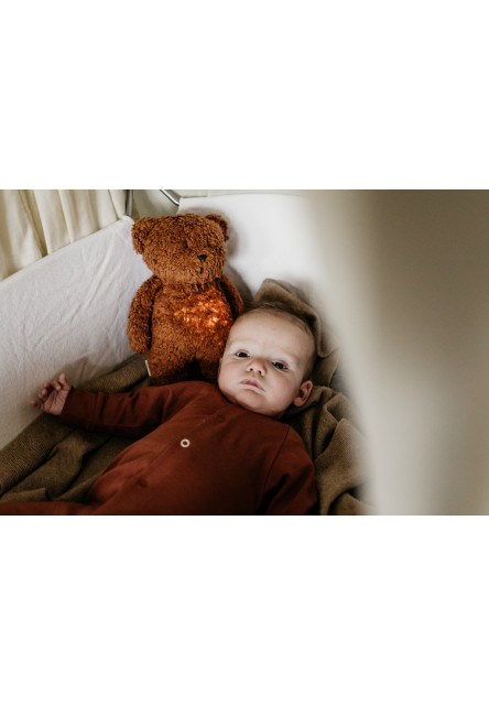 Bříško medvídka svítí a slouží jako noční světlo s výběrem sedmi barev svícení. Jemné světlo pomáhá dítěti cítit se v postýlce bezpečně. Světlo je možné zapnout i bez zvuků. Při zapnuté funkci Shake světlo zapnete zatřesením hračkou. Medvídek se při svícení nijak nezahřívá a je pro dítě zcela bezpečný.