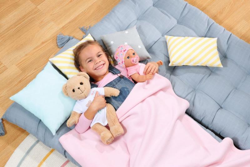 Nový kamarát pre bábiky BABY born a pre všetkých fanúšikov BABY born. Alebo je to kamarátka? Na tom nezáleží, medvedík môže byť čímkoľvek: dievčatkom, chlapčekom, bábätkom, plyšovým medvedíkom, kamarátom na hranie, maznáčikom, princeznou alebo napríklad jazdcom na skútri – od útleho veku až do doby, keď už je detstvo len vzdialenou spomienkou. Malý medvedík so sladkým úsmevom má mäkké telíčko. Je oblečený do krásneho bieleho oblečku. Má svoju vlastnú módnu kolekciu a medvedie doplnky, ale môže nosiť aj takmer čokoľvek, čo nosí bábika BABY born. Môže používať aj jej doplnky. Medvedík je navrhnutý tak, aby mu sedelo takmer všetko oblečenie pre BABY born veľkosti 43 cm. Len jej topánočky neobuje. Ale ktorý medvedík by potreboval topánočky? Vďaka pohyblivým ručičkám a nožičkám a otáčacej hlavičke ho možno ľahko prezliekať. Je veľmi pohyblivý, a preto je skvelým spoločníkom na hranie rôznych hier. Kto ako prvý niečo napíše do knižky priateľstva? Súčasťou knižky priateľstva je aj hárok samolepiek. • Medvedík BABY born. • Kamarát alebo kamarátka na hranie a maznanie na celý život. • Môže si obliecť (takmer) všetko pre BABY born. Plyšový Macko BABY born veľkosti 36 cm. Súčasťou je oblečenie, knižka priateľstva a samolepky.
