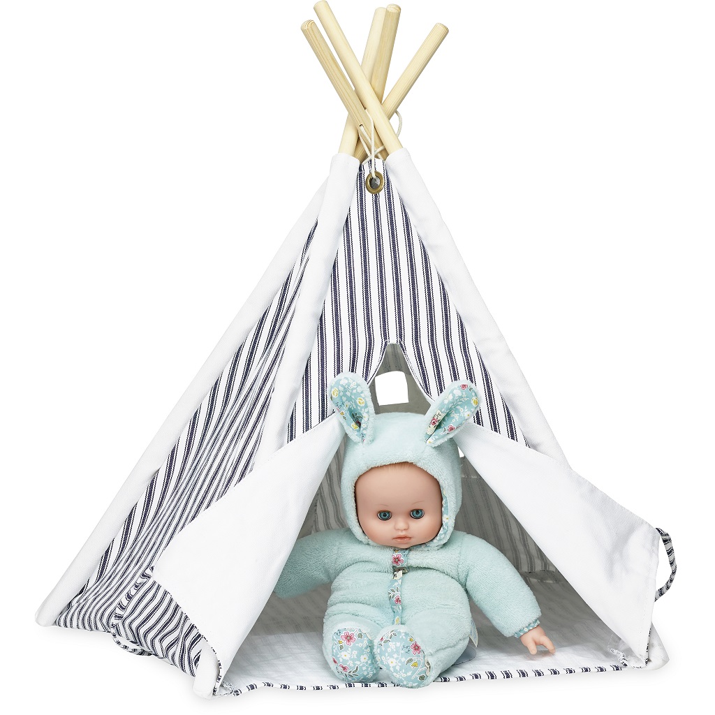Krásne pruhované típí v mini prevedení, ideálne pre bábiky. Drevený základ s textilnou prikrývkou je jednoduché zložiť. Textil je tmavo šedý a biely. Hlavné vlastnosti: típí pre bábikypevná konštrukcia