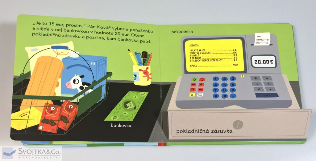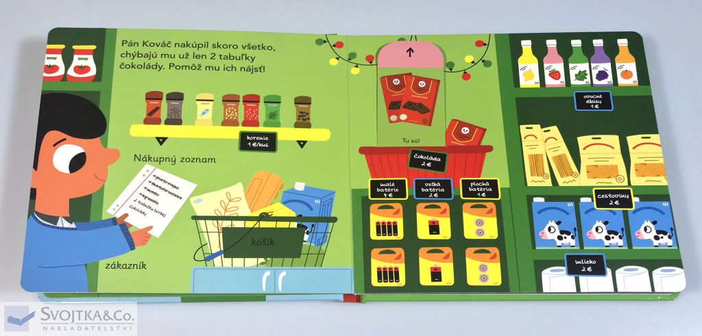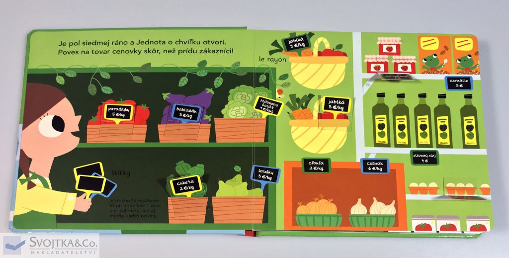 Je ráno a v samoobsluhe práve otvárajú. Skontroluj cenovky na tovar a pomôž poukladať zákazníkovi potraviny do košíka podľa jeho nákupného zoznamu. Ovocie a zeleninu treba odvážiť na váhe a tovar potom povykladať z košíka na pokladničný pás. Koľko to všetko bude stáť? A čím budú zákazníci platiť? Leporelo pre deti od dvoch rokov je plné okienok a pohyblivých prvkov, vďaka ktorým si precvičí aj jemnú motoriku.