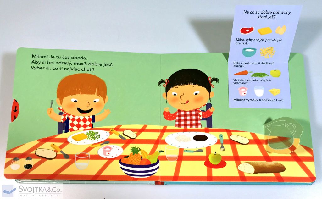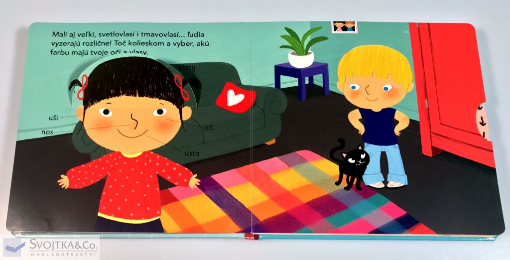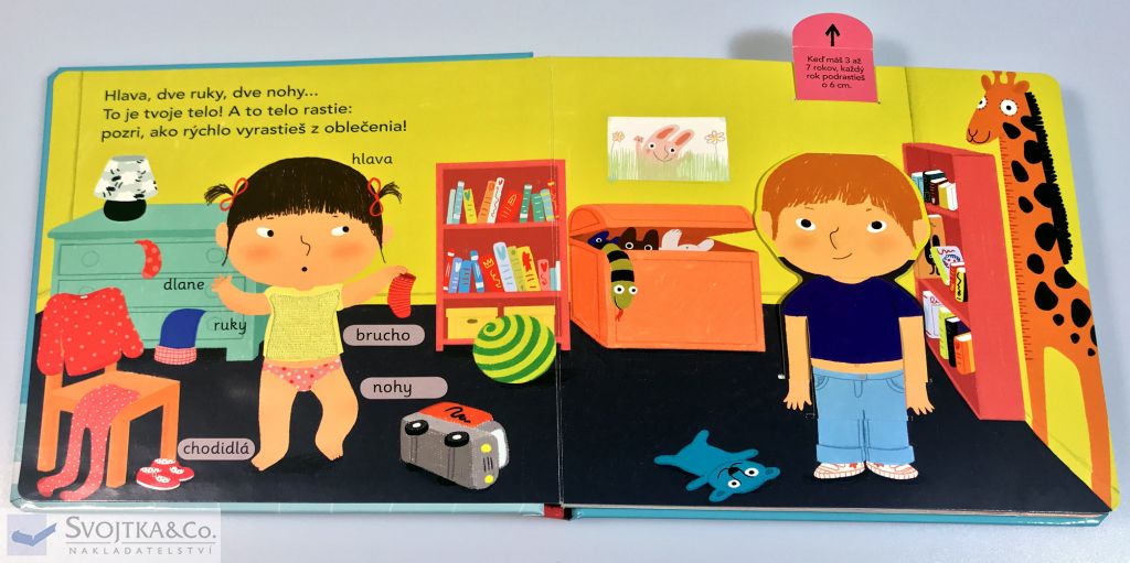 Čo si dnes oblečieš? Pozri sa, ako rýchlo rastieš! O chvíľu ti bude oblečenie malé. A čo tvoja tvár? Môžeš sa smiať, uškŕňať sa a mračiť. Akú farbu majú tvoje oči a vlasy? Tvoje telo potrebuje aj jedlo, aby malo energiu. A pohyb na čerstvom vzduchu. Rýchlo – poďme na ihrisko, bude zábava! A už je zasa večer a musíš ísť spať. Nezabudni si vyčistiť zuby, kým zaľahneš pod perinu. Dobrú noc! Leporelo pre deti od dvoch rokov je plné okienok a pohyblivých prvkov, vďaka ktorým si precvičí aj jemnú motoriku.