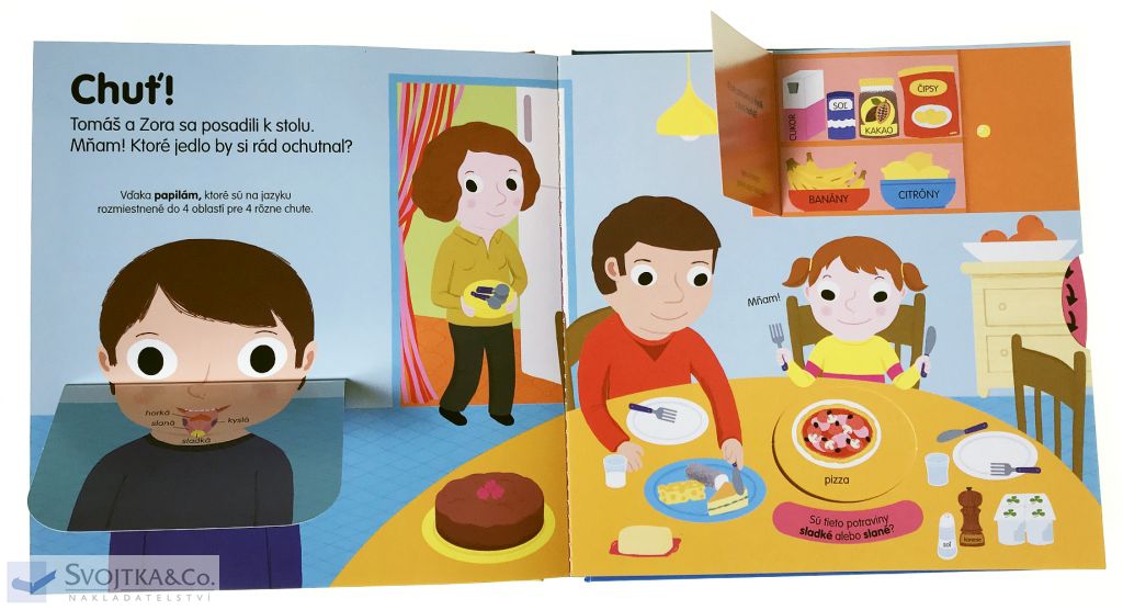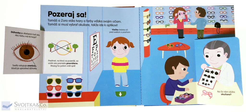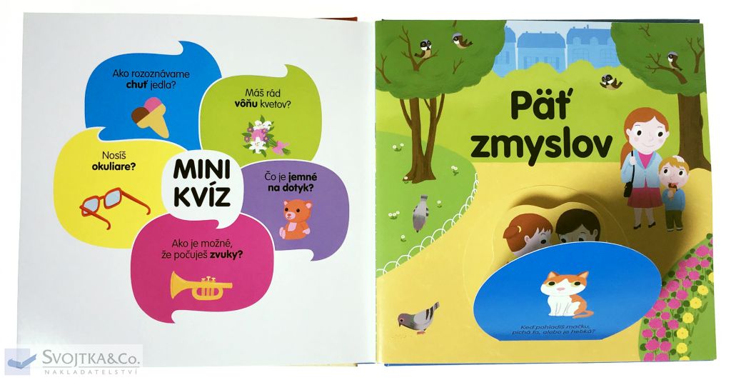 Zrak, sluch, čuch, chuť a hmat. Ľudské telo má spolu päť zmyslov. Nauč sa ich poznávať. Na čo slúžia okuliare? Ako je možné, že počuješ zvuky? Máš rád vôňu kvetov? Čo je slané, sladké alebo horké? A čo je na dotyk hebučké? Leporelo pre deti od štyroch rokov je plné okienok a pohyblivých prvkov, vďaka ktorým si dieťa precvičí aj jemnú motoriku.