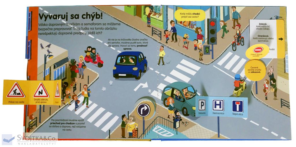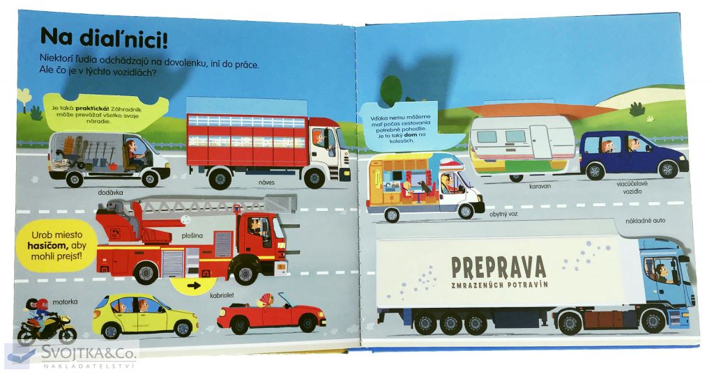 Prečo majú autá motor? Čo preváža nákladná loď? Kde sa otáča metro? A akou rýchlosťou ide rýchlik? Zisti, ako to vyzerá na križovatke, kto má prednosť a kto nedodržal cestné predpisy. Leporelo pre deti od štyroch rokov je plné okienok a pohyblivých prvkov, vďaka ktorým si dieťa precvičí aj jemnú motoriku.