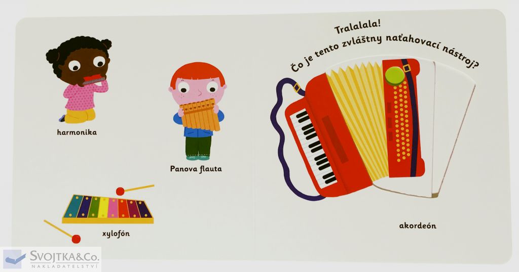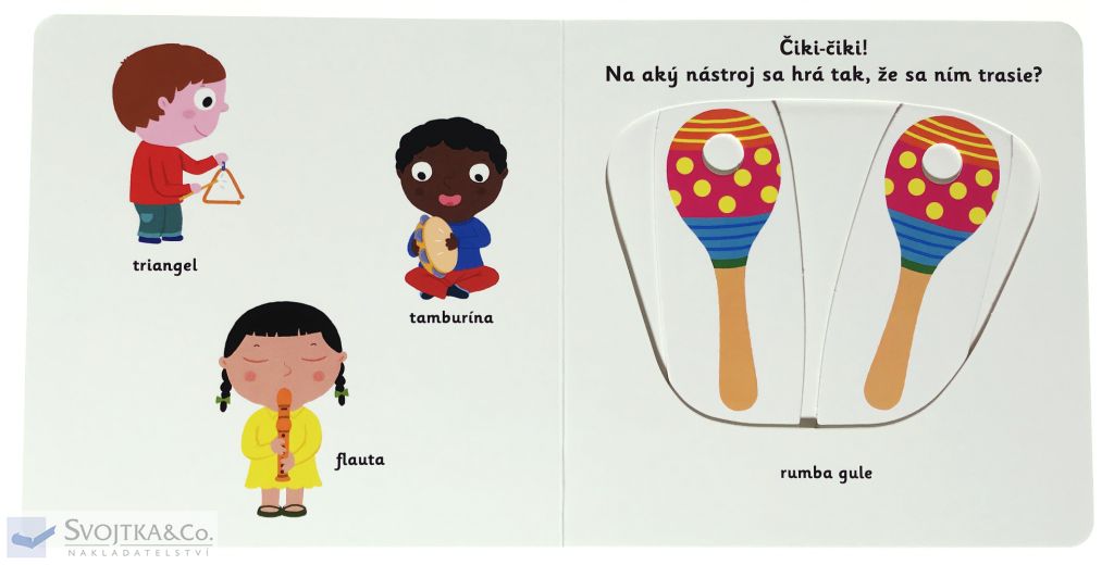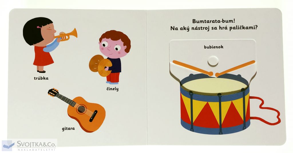 Gitara, husle, flauta. Aké poznáš hudobné nástroje? Vieš ich pomenovať? Poznávaj a uč sa z obrázkov. Knižka je vhodná pre najmenšie deti, ktoré si vďaka nej precvičia jemnú motoriku – obsahuje totiž veľké množstvo najrôznejších pohyblivých častí a okienok, ktoré obrázky oživujú.