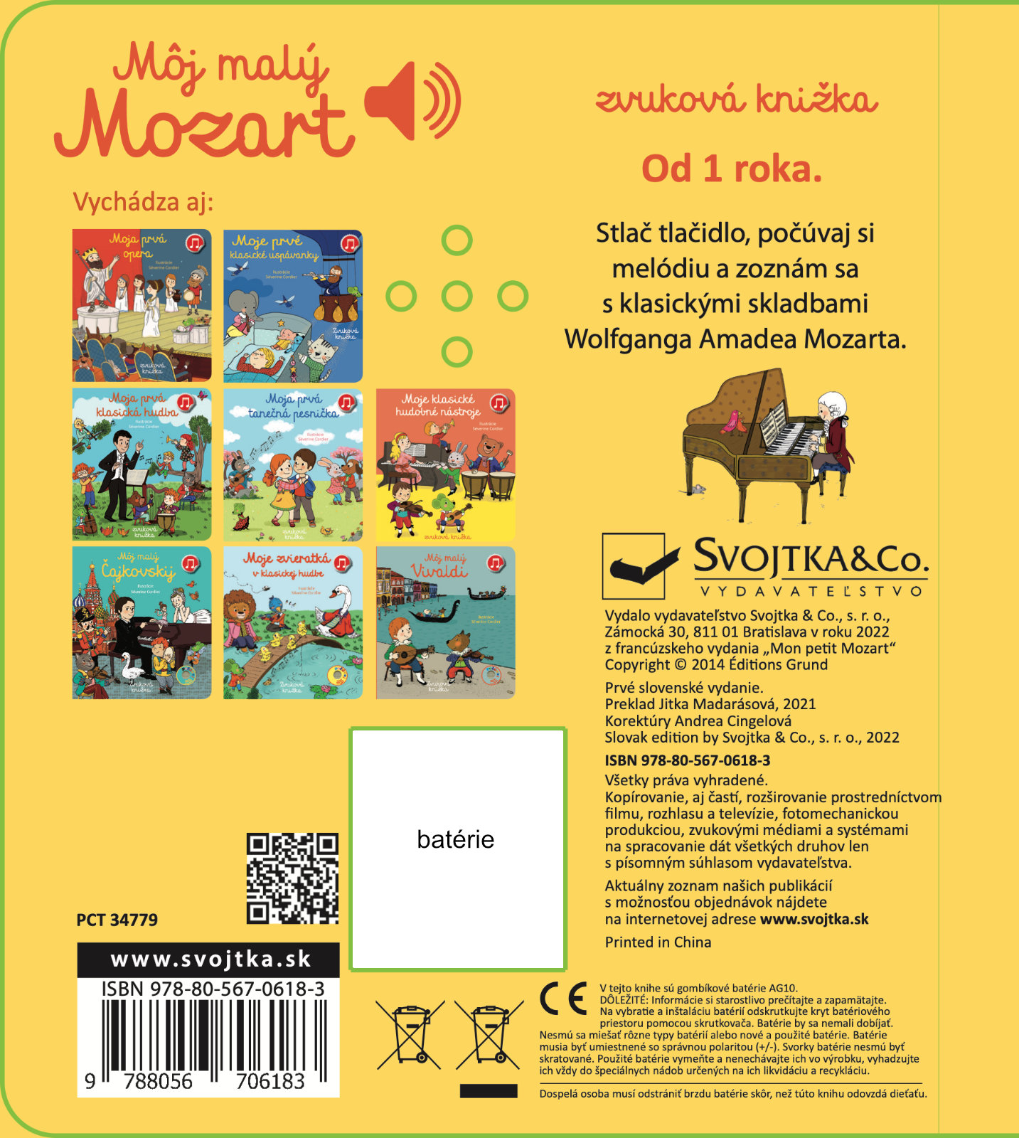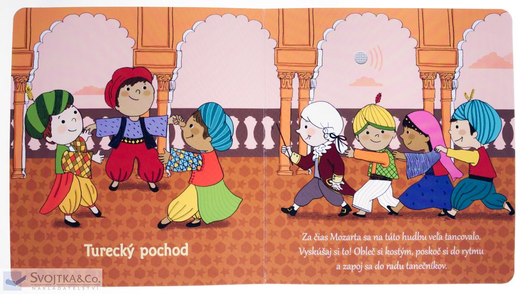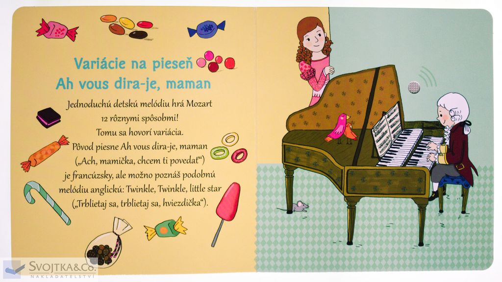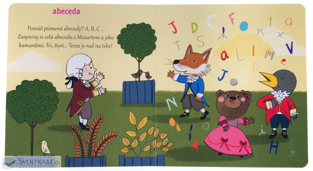 Wolfgang Amadeus Mozart je najslávnejším hudobným skladateľom všetkých čias. Už ako dieťa bol zázračne nadaný. Aj táto knižka je určená deťom. Z rozsiahleho Mozartovho diela ich zoznamuje so skladbami, ktoré sú najznámejšie, alebo ktoré si spolu s Mozartom a jeho ilustrovanými kamarátmi môžu malí čitatelia zaspievať. Pestré ilustrácie dopĺňa stručné rozprávanie o skladbách, o hudobných nástrojoch v nich použitých alebo o Mozartových časoch. Na každej dvojstrane je možné stlačiť tlačidlo a vypočuť si hudobnú pasáž, o ktorej sa v knihe práve píše. Kniha je skvelým interaktívnym zoznámením s týmto velikánom klasickej hudby. Obsahuje vymeniteľné gombíkové batérie AG10.