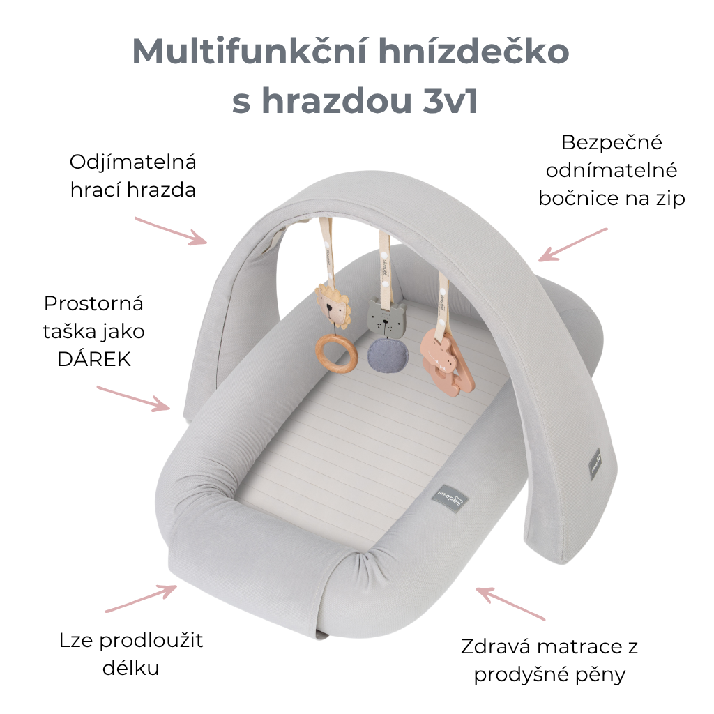 Multifunkční hnízdečko pro miminko s hrazdičkou a hračkami 3 v 1 Sleepee Grey