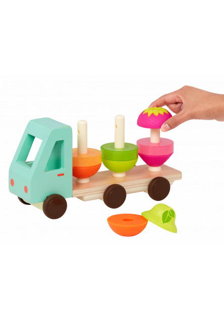 Náklaďák v krásném dřevěném provedení veze pomeranč, hrušku a jahodu, které se skládají ze 3 dílů. Dítě je skládá na sebe podle barvy a tvaru.