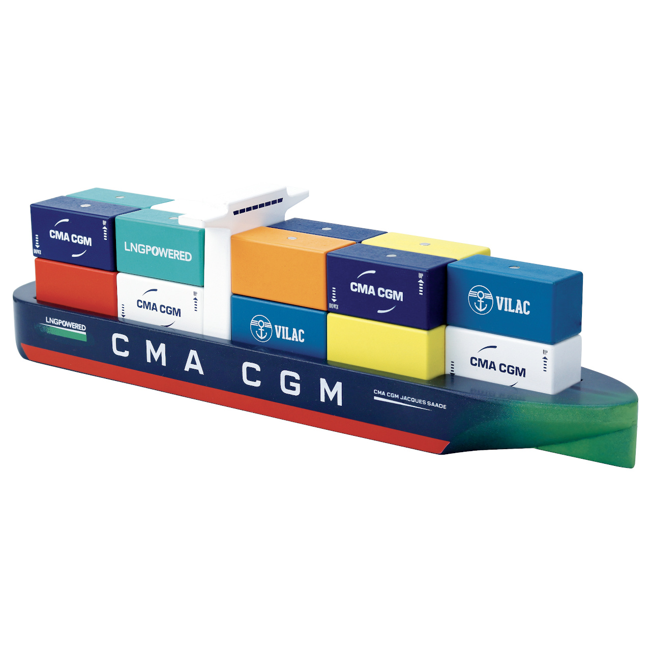 Farebná drevená nákladná loď s magnetickými kontajnermi je replikou lode Jacques Saadé, prvé lo...zobrazit více