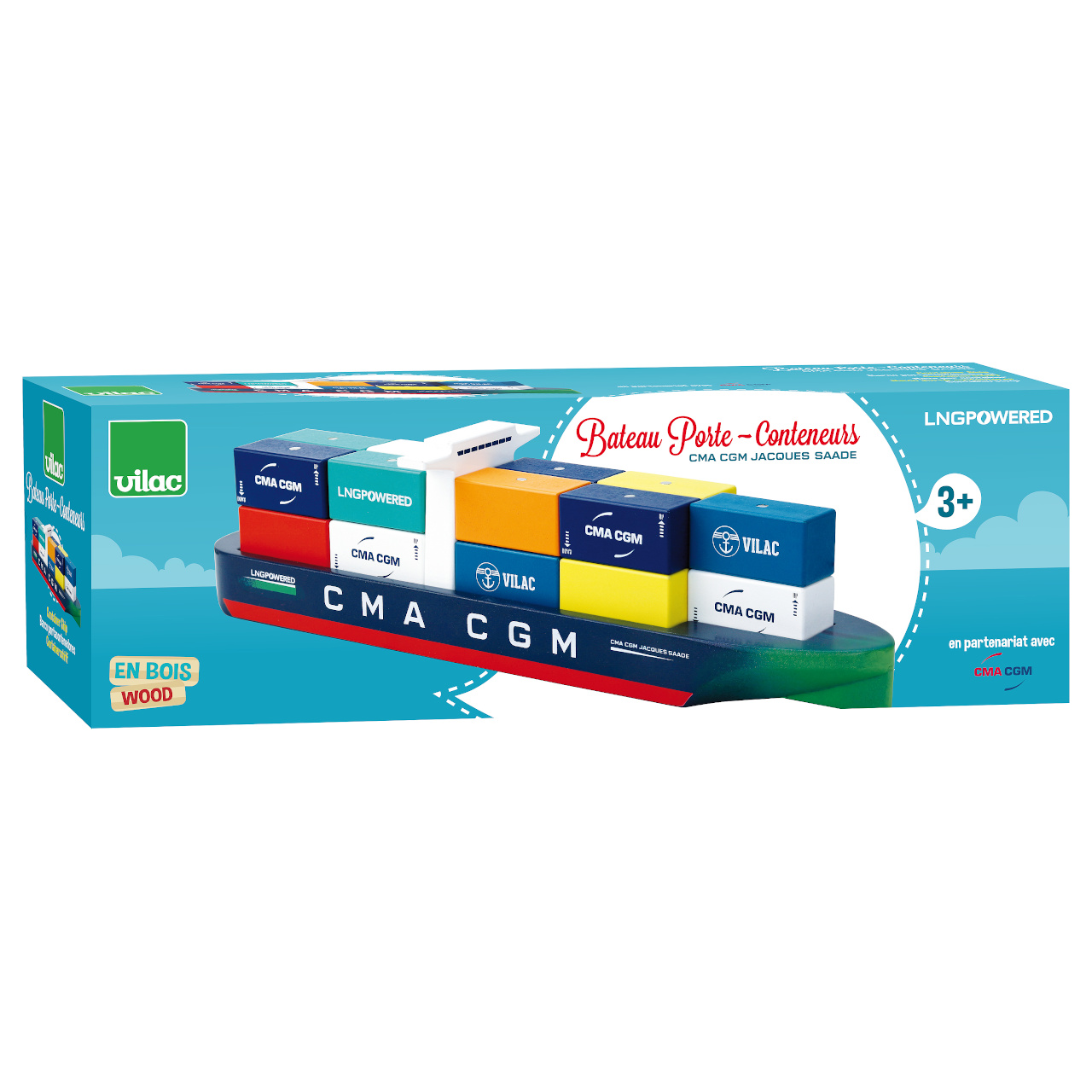 Farebná drevená nákladná loď s magnetickými kontajnermi je replikou lode Jacques Saadé, prvé lode využívajúce na pohon kvapalný zemný plyn (LNG). Hračka bola vyrobená v spolupráci s čelnou francúzskou prepravnou spoločnosťou CMA CGM. Je súčasťou Vilacity kolekcie a je so všetkými jej súčasťami plne kompatibilná, ďalšie samostatné rozšírenia prinesú variabilitu a prehĺbi zážitok z hry. Hlavné vlastnosti:loď a 18 kontajnerovmagnetické spojeniakompatibilná so všetkými súčasťami Vilac Vilacity kolekcievyrobené ekologicky, šetrne k prostrediu V2357 – Prístavný žeriav Vilacity (nie je súčasťou sady, nájdete v našej ponuke): V2358 – Nákladné auto Vilacity (nie je súčasťou sady, nájdete v našej ponuke): Príklad zostavy lodě s ďalšími súčasťami kolekcie Vilacity:
