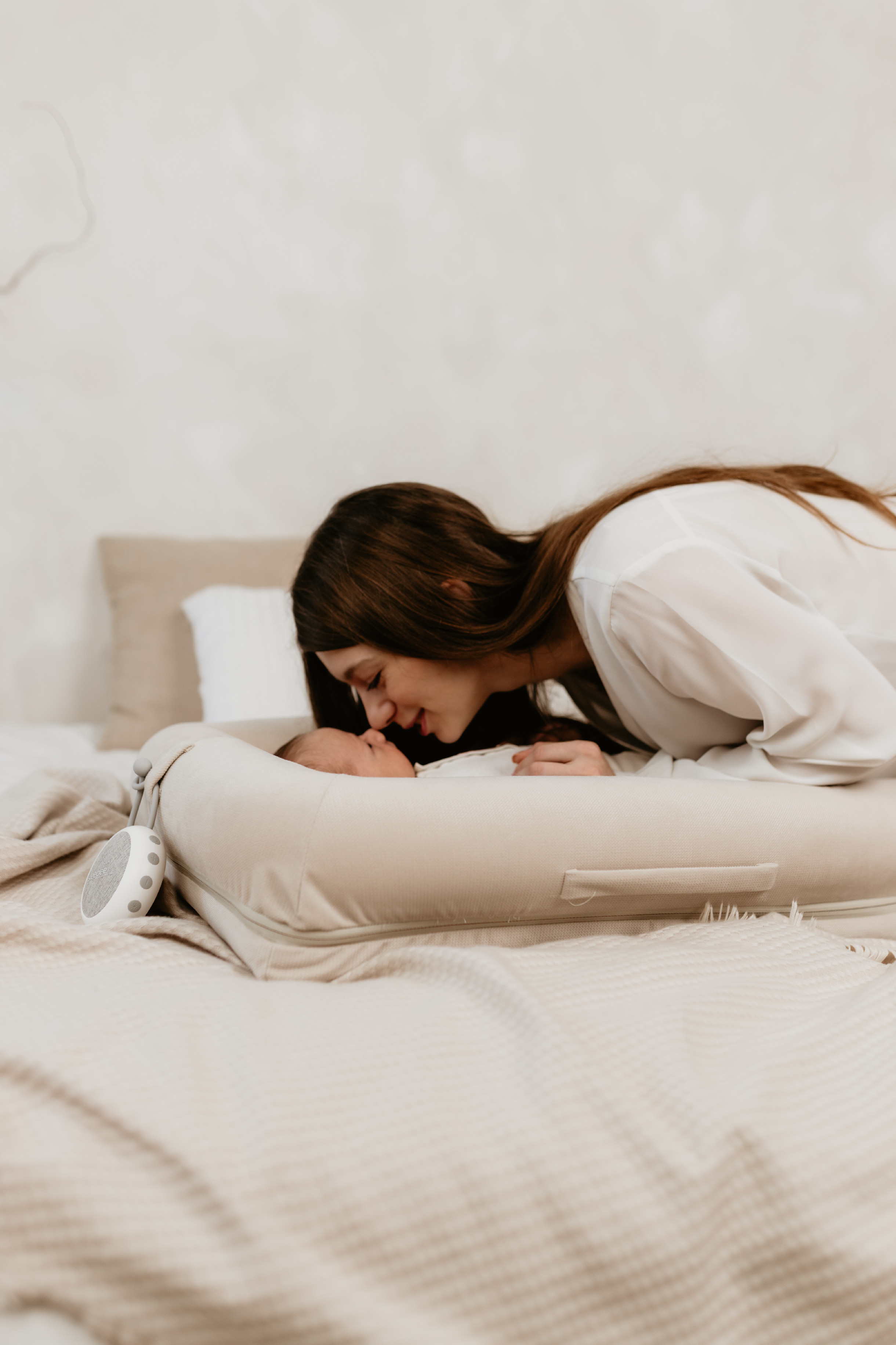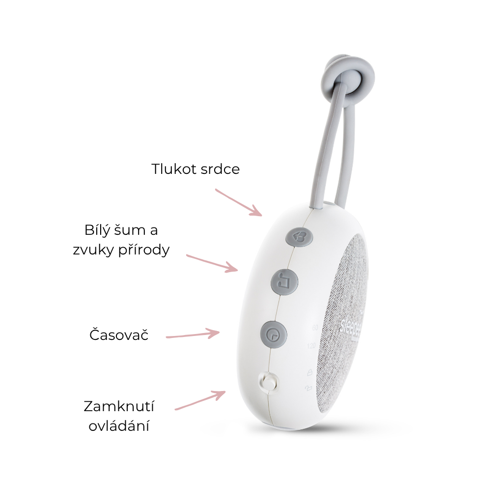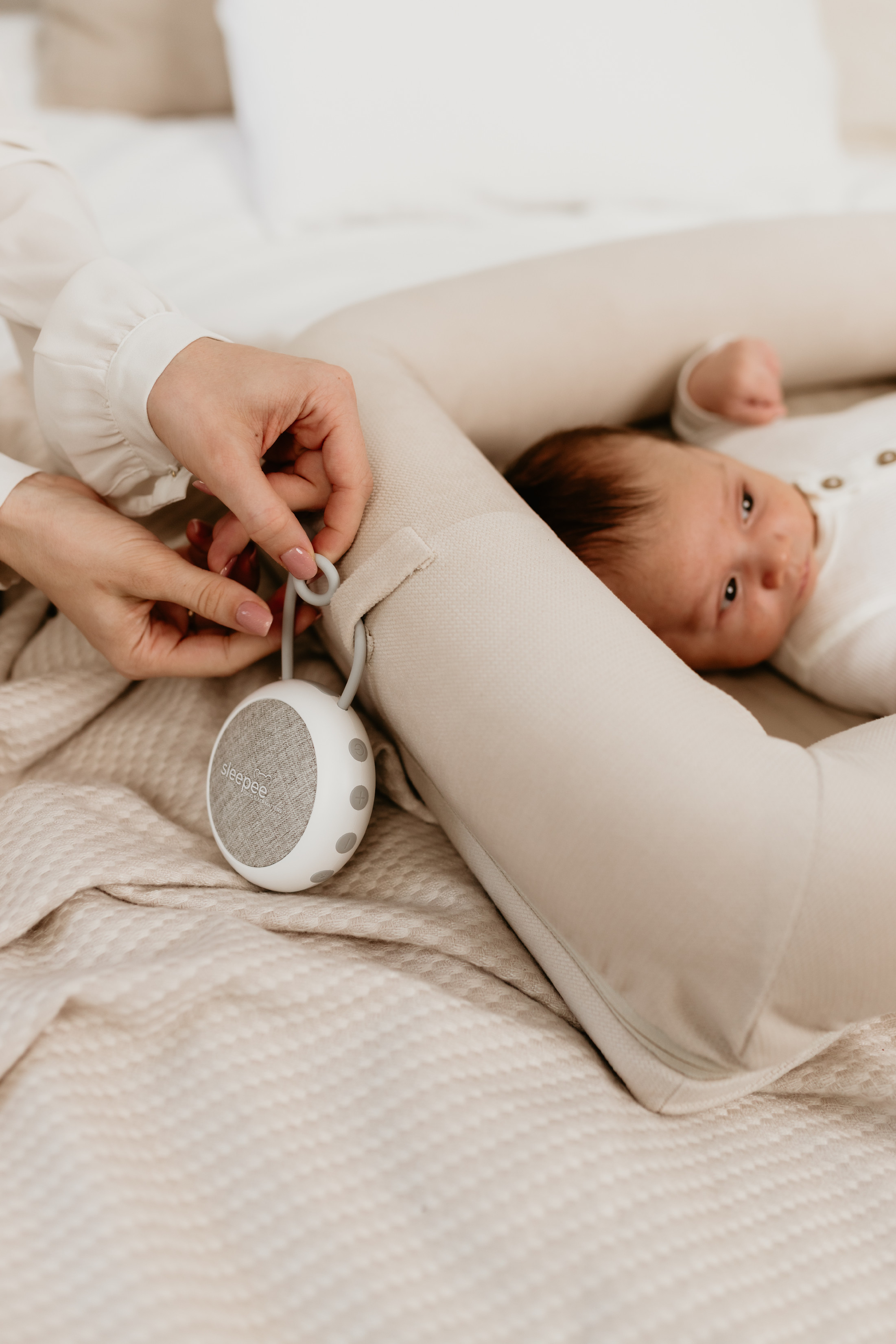 Nastavitelná hrazdička s hračkami a bílým šumem 2v1 Sleepee obsahuje hrací hrazdičku se závěsnými hračkami a zvukový modul s bílým šumem, tlukotem srdce a zvuky deště a přírody. K sadě získáte luxusní prostornou tašku jako dárek zdarma pro snadný přenos hnízdečka.
