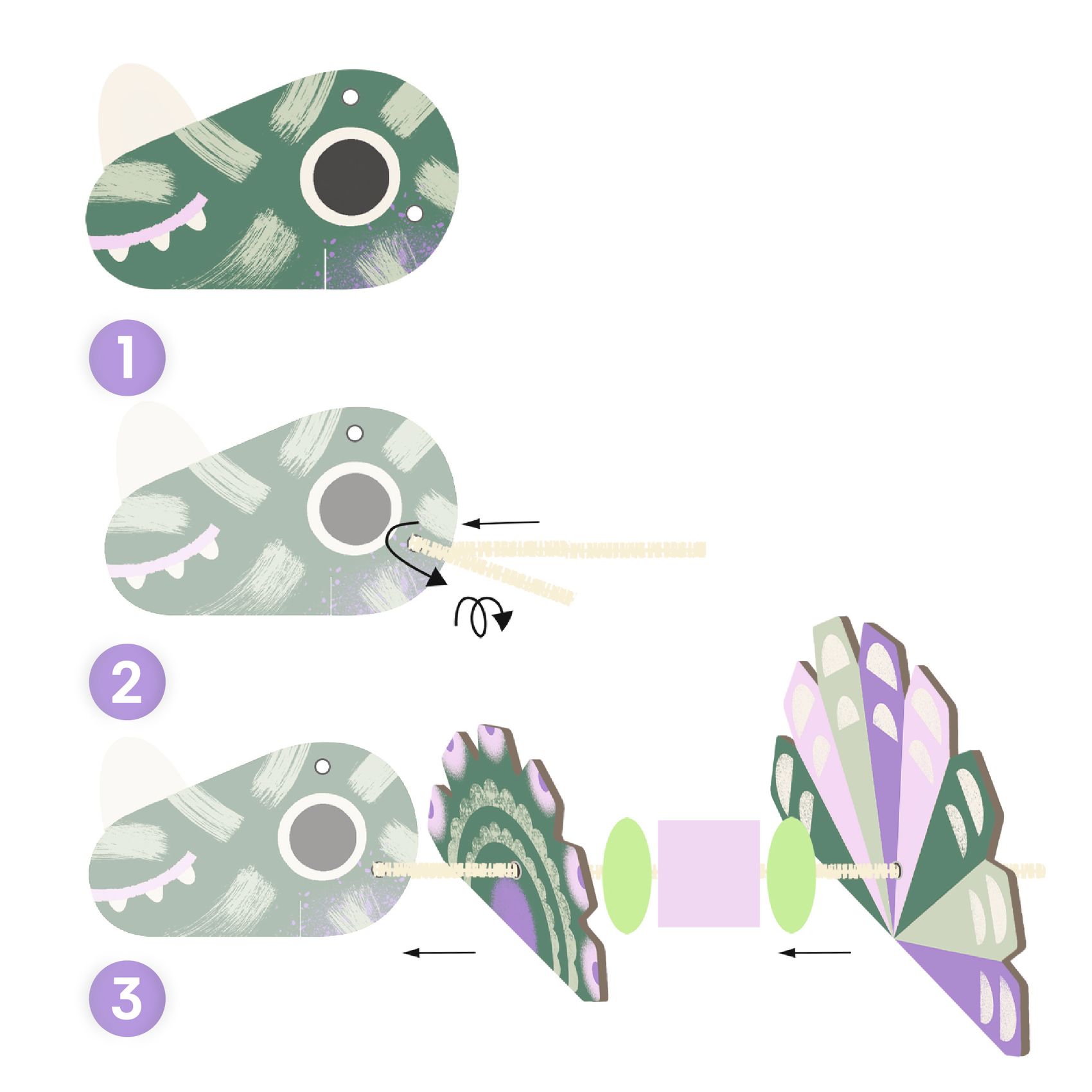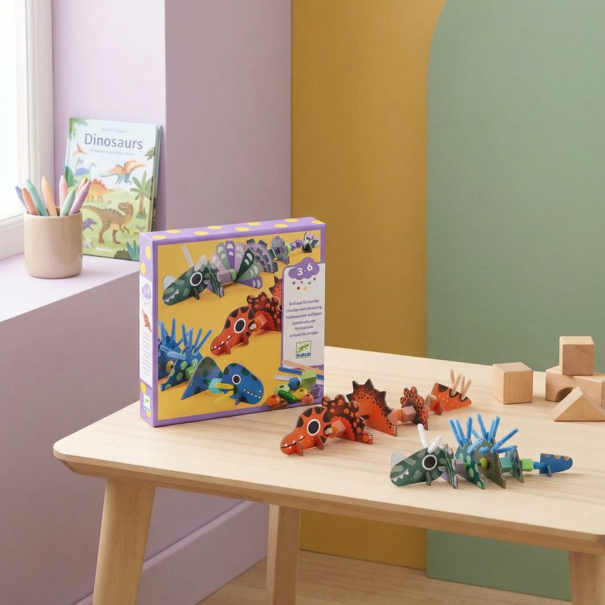 Navlékání Dinosauři Vytvoř si vlastní dinosaury: navlékej dřevěné korálky a kartonové dílky na chlupaté drátkyNavlékání Dinosauři je kreativní aktivita pro děti od 3 let, při které si sestaví až 3 originální dinosaury.Dítě navléká dřevěné korálky a předseknuté kartonové prvky na ohebný chlupatý drátek (žinylka) a kombinuje dílky podle návodu nebo podle vlastní fantazie.Tvoření přirozeně rozvíjí jemnou motoriku, trpělivost a představivost – a hotoví dinosauři jsou skvělí i na hraní.Obsah balení 3× kartonová deska s prvky k vyloupnutí 6× chlupatý drátek na navlékání 39× dřevěný korálek 1× obrázkový návodRychlý přehled doporučený věk: 3–6 let typ aktivity: navlékání a skládání (bez lepidla) rozvíjí: jemnou motoriku, koordinaci oko–ruka, kreativitu výsledek: 3 dinosauři na hraní nebo vystavení