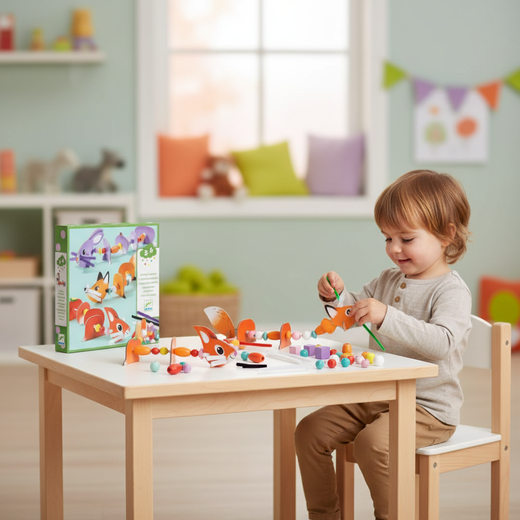 Navlékání Roztomilá zvířátka Oživ 3 zvířátka: navlékej dřevěné korálky a dílky z pevného kartonu na žinylkuNavlékání korálků – Roztomilá zvířátka je kreativní sada, ve které děti postupně skládají a navlékají dílky tak, aby vznikla 3 milá zvířátka.Použijí dřevo (korálky), pevný předřezaný karton a chlupaté drátky (žinylky) – výsledek je prostorový, hravý a každý model lze snadno přizpůsobit vlastní fantazii.Rychlý přehled doporučený věk: od 3 let (cca do 6 let) co děti vytvoří: 3 zvířátka z navlékaných dílků materiály: dřevěné korálky + dílky z tlustého kartonu + žinylky rozvíjí: jemnou motoriku, koordinaci oko–ruka, kreativitu zodpovědná výroba: papír/karton FSCObsah balení 3 kartonové desky s dílky k vyloupnutí chlupaté drátky (žinylky): 9 ks dřevěné korálky: 38 ks 1 barevný obrázkový návodJak to funguje Vyloupněte kartonové dílky z desek. Vyberte si zvířátko (nebo kombinujte dílky podle sebe). Navlékejte korálky a kartonové prvky na chlupatý drátek. Dolaďte detaily – vznikne vlastní „zvířátko“.Pro koho je pro děti, které baví navlékání a skládání z dílků jako tvoření bez barev – ideální na klidné soustředění pro malé tvůrce, kteří rádi vymýšlejí vlastní kombinace