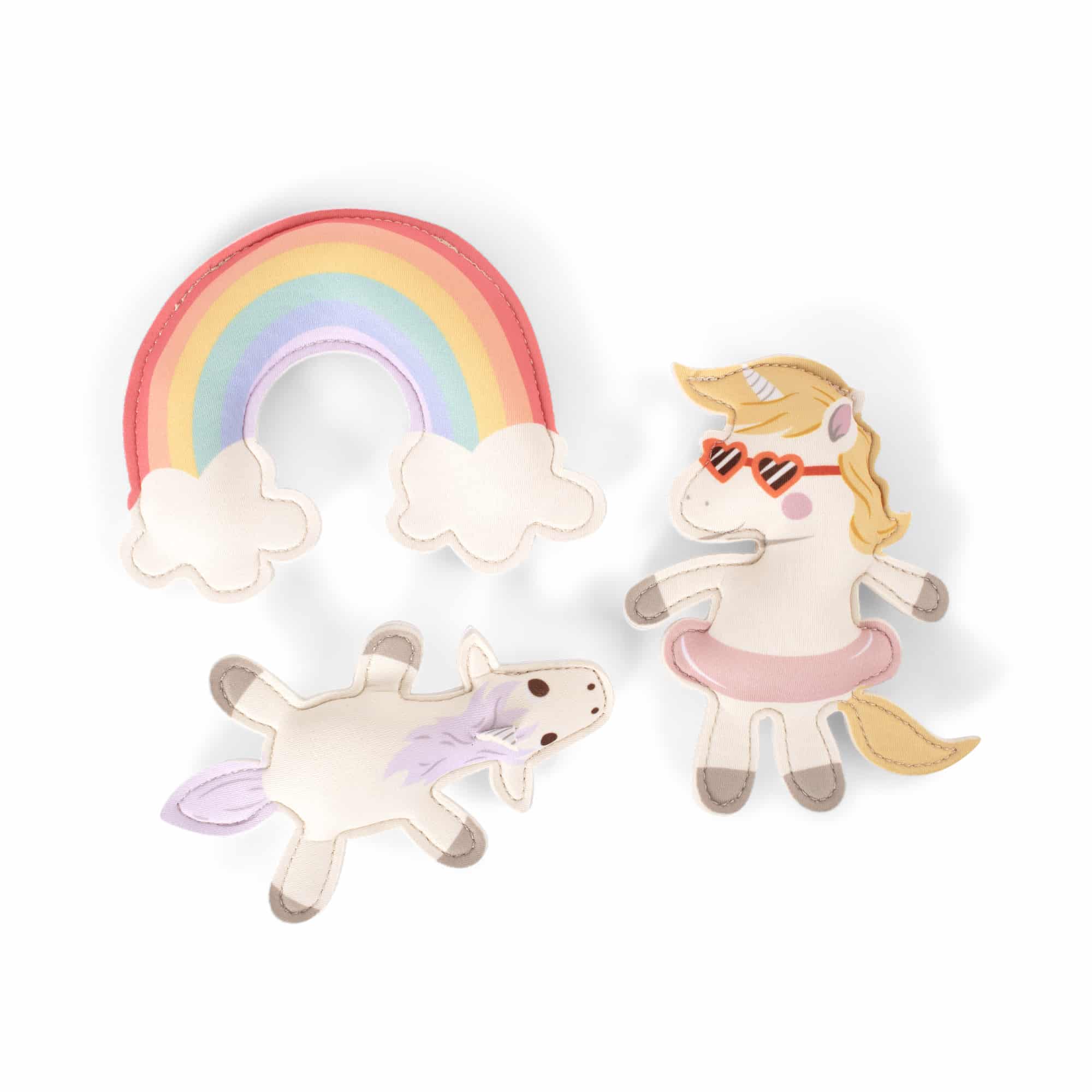 V tomto čarovnom sete sa stretnete s dvoma pôvabnými jednorožcami a farebnou dúhou – pripravenými potápať sa, plávať a točiť sa vo vode. Každá figúrka sa vo vode pohybuje svojím vlastným spôsobom: niektoré klesajú, iné plávajú – no všetky podnecujú zvedavosť a pozývajú k hre, objavovaniu a úžasu. Vďaka jemným pastelovým farbám a hravým tvarom premenia figúrky každé kúpanie na snový svet plný fantázie a pohybu.