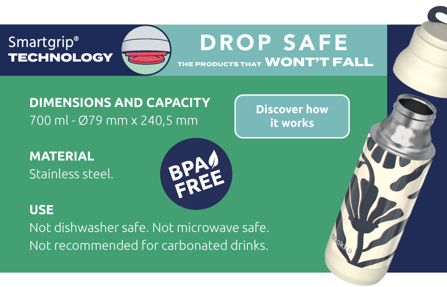 Quokka Pulse je součástí kolekce lahví a hrnků Drop Safe se speciálním dnem Smartgrip®, které při postavení na hladký povrch brání převržení a nechtěnému vylití obsahu láhve.