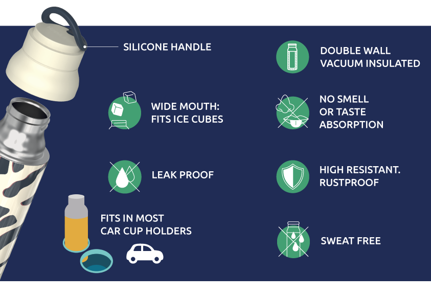Termoska Quokka Pulse z vysoce kvalitní dvoustěnné oceli se spolehlivým, 100% těsnicím uzávěrem udrží váš nápoj dle potřeby teplý či studený. Široké hrdlo umožňuje vložení kostek ledu. Termoska udrží teplotu studeného nápoje s ledem až 48 hodin, studeného nápoje až 16 hodin a teplého nápoje až 12 hodin. Silikonové poutko, které je zakomponované do víčka láhve, usnadňuje přenášení.