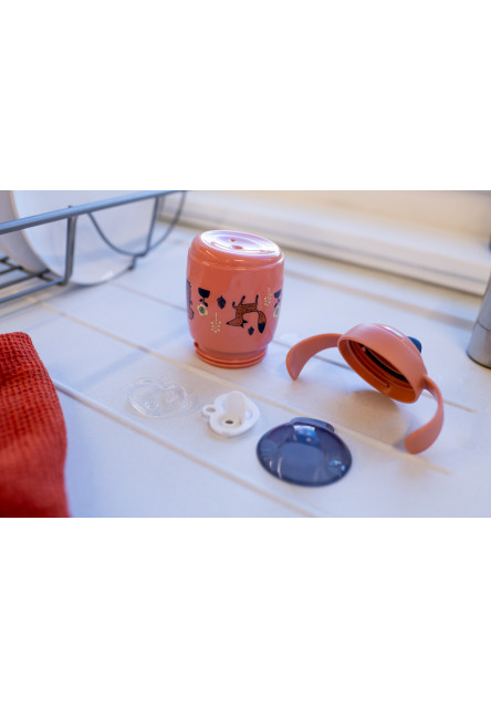 Hrnek a všechny jeho součásti je možné mýt v horním koši myčky. Neobsahuje bisfenol.