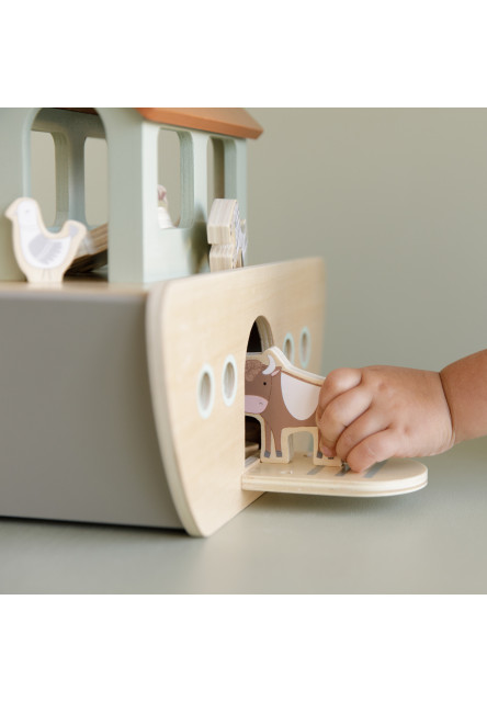 25-dílná dřevěná sada obsahuje archu s dveřmi, palubu, kterou lze zvednout a přivést všechna zvířata na palubu. Noe vezme svoji ženu a velkou skupinu zvířat na cestu přes oceán: 2 lvy, 2 slony, 2 zebry, 2 opice, 2 holuby, 2 krokodýly, 2 želvy, 2 žirafy, 2 pštrosy, 2 krávy, slepici a kohouta.