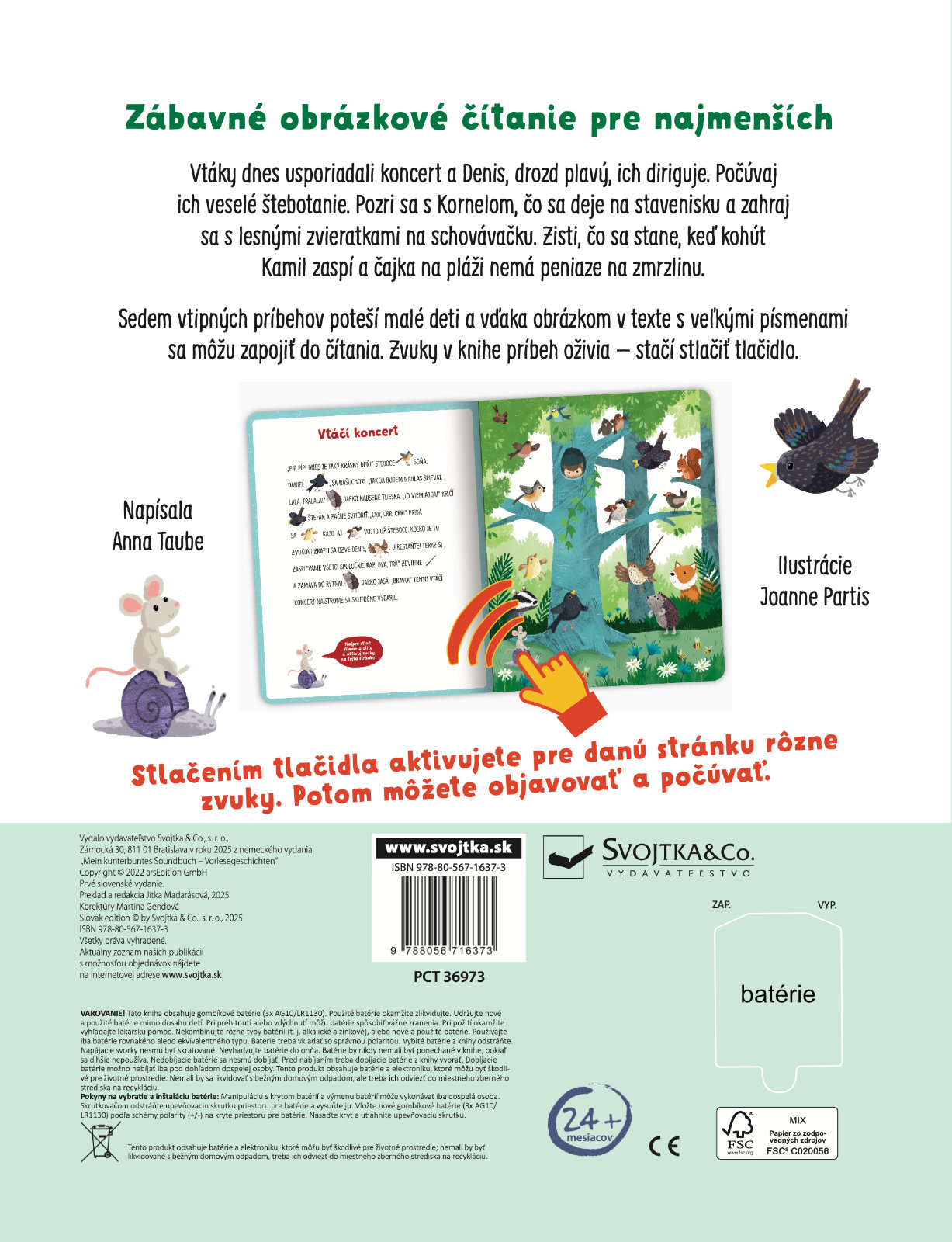 Čítaj a dopĺňaj – zábavné obrázkové čítanie pre najmenších čitateľov! V knihe nájdete sedem krátkych a veselých príbehov, ktoré deti ľahko pochopia a obľúbia si ich. Každý text je písaný veľkými písmenami a doplnený obrázkami miesto niektorých slov, takže sa môžu aktívne zapojiť do čítania a príbeh spoluvytvárať. Navyše každú scénu oživujú zvuky - stačí stlačiť tlačidlo a nechať príbeh zaznieť. Kniha podporuje porozumenie, slovnú zásobu, čitateľské zručnosti aj zmysel pre humor a je ideálnou na spoločné čítanie rodičov s deťmi.Počet strán: 16