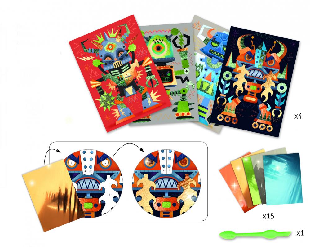 Kreatívna sada Roboti obsahuje štyri ilustrované obrázky s motívom robota. Obrázky obsahujú lepivé časti prekryté papierikmi, ktoré postupne odstraňuješ špachtličkou a na lepivé miesta aplikuješ fóliu. Fóliu iba pritlačíš prstom a následne hárok fólie zdv