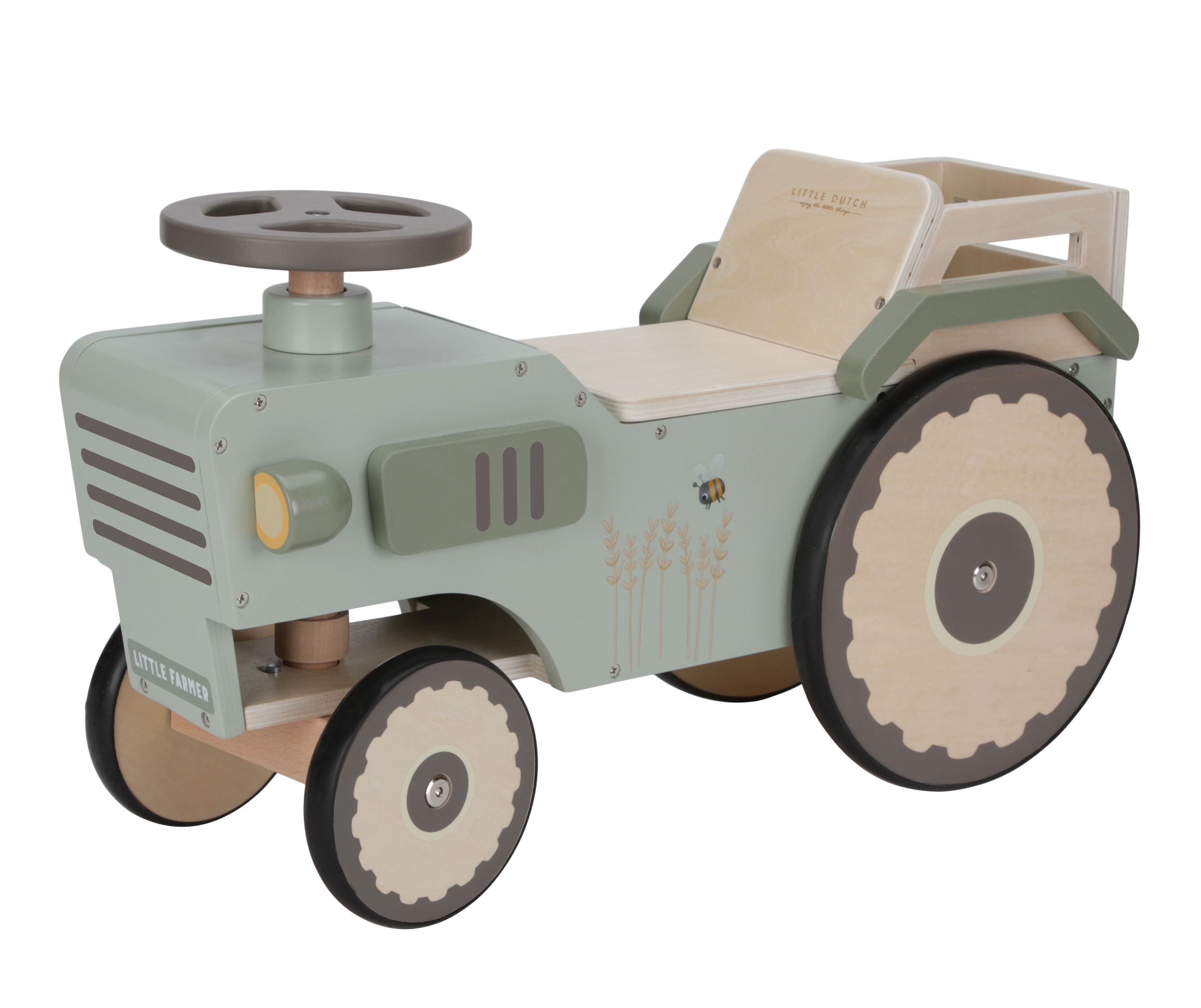 Dětské odrážedlo v originálním dřevěném provedení v podobě traktoru s pohodlným sedátkem a volantem na držení. Přihrádka za sedadlem umožňuje povozit na traktoru i oblíbeného plyšáka či panenku nebo odvézt náklad kostek. Gumové proužky na kolech chrání podlahu před poškrábáním.