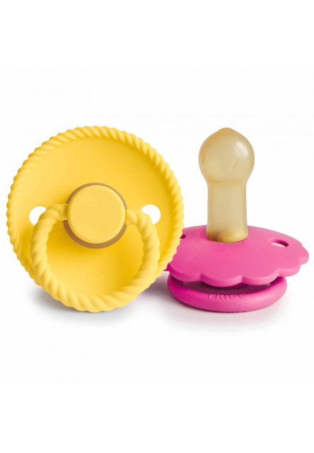 Cumlík FRIGG Daisy s vrúbkovanými okrajmi, ktoré napodobňujú lupene kvetov, sú podstatou elegantného dizajnu. Kvetinové a moderné detaily upútajú pozornosť každej štýlovo orientovanej mamičky. Vďaka tomu sa FRIGG perfektne hodí pre dnešné matky, ktoré pri výbere základných potrieb pre bábätko prikladajú veľký význam klasickému dizajnu s modernými prvkami. Cumlík FRIGG Daisy plný šarmu je dostupný v monochromatických aj zmiešaných farbách. FRIGG Daisy je cumlík s okrúhlym tvarom cumlíka. Okrúhly cumlík tvarom aj materiálom pripomína materinský prsník. Vysvetlením je, že keď sa dieťa chystá dojčiť, jazyk sa zroluje okolo bradavky a vytvorí podtlak, ktorý spôsobí tok mlieka. Keď dieťa saje okrúhly cumlík, gúľa okolo neho jazyk rovnako. Okrúhly tvar odporúčajú detskí chiropraktici a pôrodnice v Dánsku.