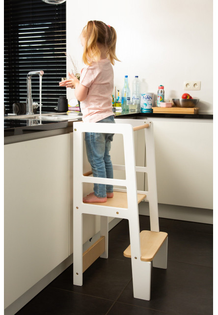 Učící věž v krásném dřevěném provedení je bezpečný druh schůdků, na které mohou děti samy snadno vylézt. Využijete ji v kuchyni, aby se vaše dítě mohlo dívat nebo i pomáhat při přípravě jídla. Je užitečná i v koupelně, kde se dá používat u umyvadla na čištění zubů nebo mytí rukou.