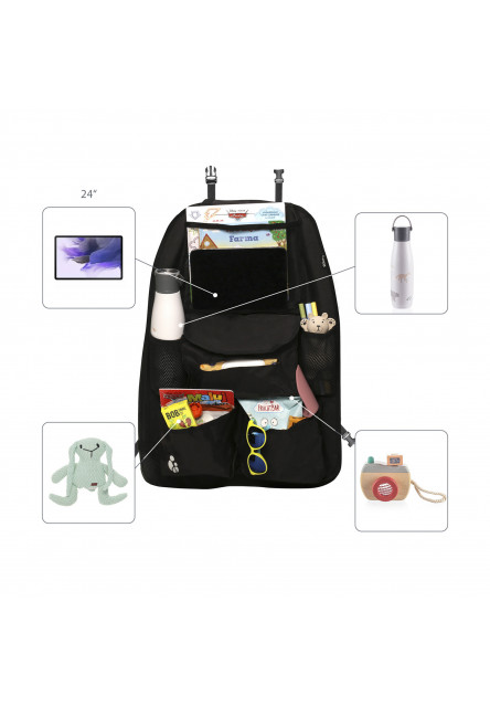 Chytrý a efektívny organizér na sedadlo auta spríjemnia cestu nielen vám, ale vďaka vrecku na tablet tiež vašim deťom, ktoré sa môžu zabaviť sledovaním rozprávok. Organizér udrží na svojom mieste tiež dve fľaše na nápoje, takže sa netreba obávať vyliatiu. Vrecko na vreckovky a dve hlboké vrecká na ďalšie predmety, ako sú napríklad hračky, robia z organizéra príjemnú cestovnej pomôcku, ktorá pomôže udržať poriadok vo vozidle aj pri cestovaní s vašimi najmenšími. Organizér sa vďaka prackám ľahko pripevní na zadnú stranu sedadla a ľahko ho tiež odoberiete.