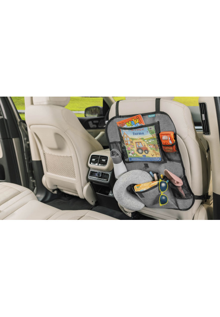 Praktický organizér na sedadlo s vreckom na tablet je perfektný spoločník na každú cestu s deťmi. Vrecko na tablet chráni jeho dotykovú obrazovku a umožňuje k tabletu rýchly prístup. Priehľadnosť vrecká zaisťuje jeho perfektný obraz. Organizér okrem toho obsahuje dva držiaky na fľaše s pitím. Svojou univerzálnosťou pripevnenie na sedadlo je kompatibilný takmer s každým vozidlom. Pripevniť možno pomocou praktických spôn s nastaviteľnou dĺžkou, čo pomáha regulovať jeho umiestnenie. Okrem toho obsahuje ďalšie vrecko na ukladanie drobností na cesty a dve vrecká zo sieťoviny na mobil alebo iné maličkosti.