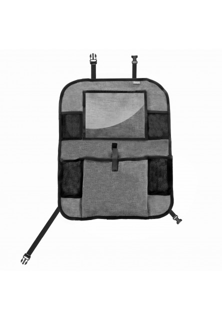 Praktický organizér na sedadlo s vreckom na tablet je perfektný spoločník na každú cestu s deťmi. Vrecko na tablet chráni jeho dotykovú obrazovku a umožňuje k tabletu rýchly prístup. Priehľadnosť vrecká zaisťuje jeho perfektný obraz. Organizér okrem toho obsahuje dva držiaky na fľaše s pitím. Svojou univerzálnosťou pripevnenie na sedadlo je kompatibilný takmer s každým vozidlom. Pripevniť možno pomocou praktických spôn s nastaviteľnou dĺžkou, čo pomáha regulovať jeho umiestnenie. Okrem toho obsahuje ďalšie vrecko na ukladanie drobností na cesty a dve vrecká zo sieťoviny na mobil alebo iné maličkosti.