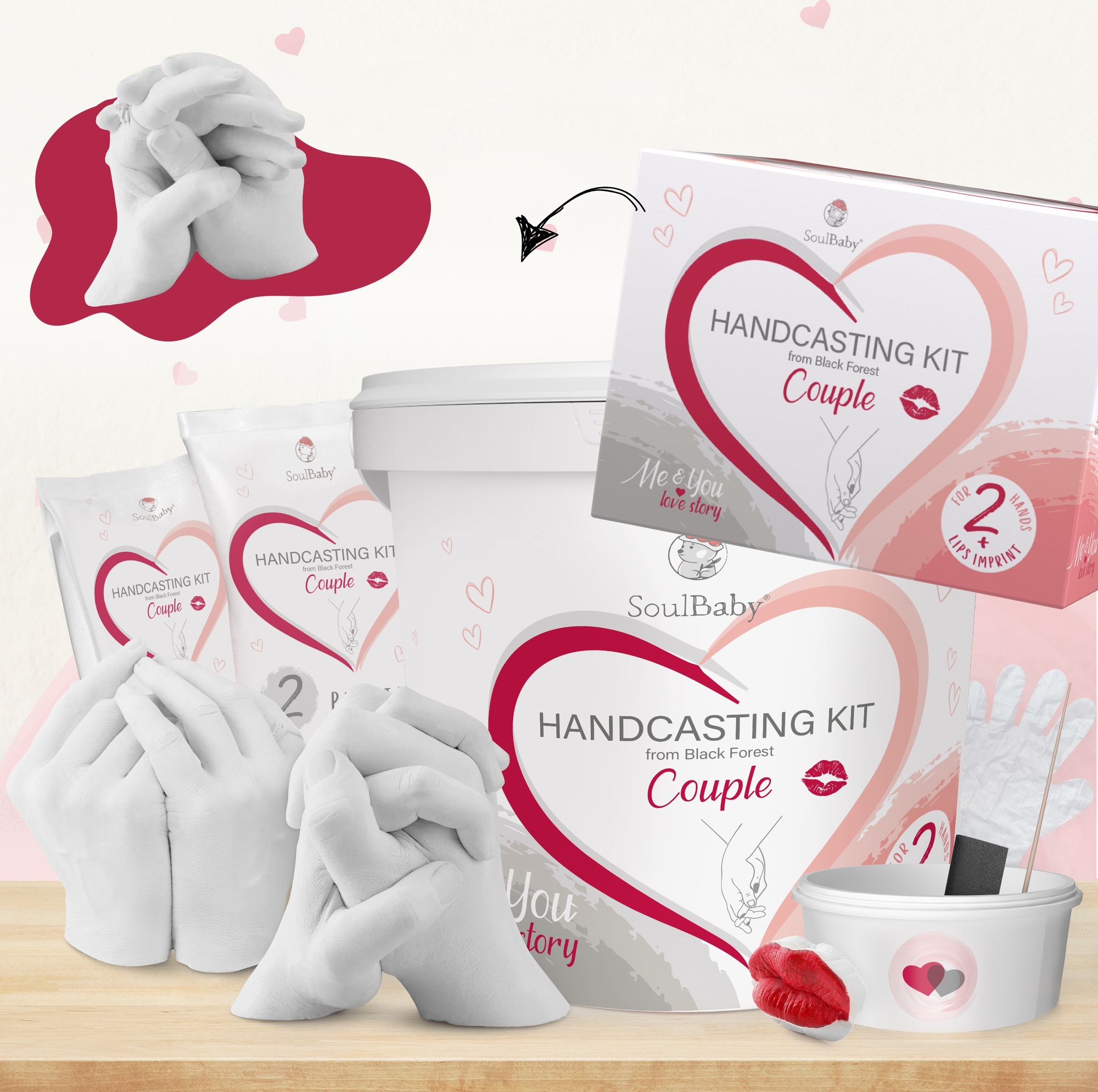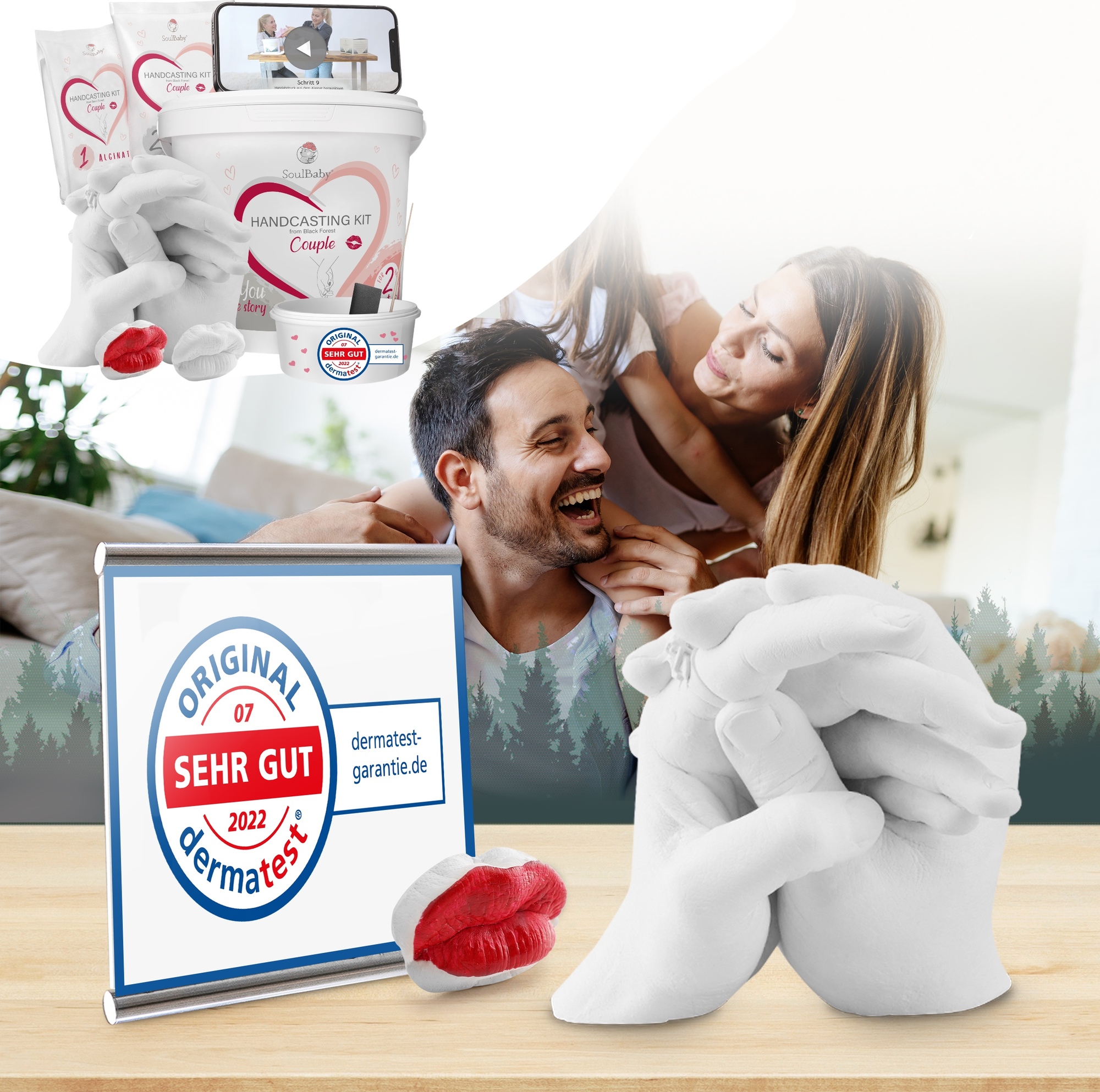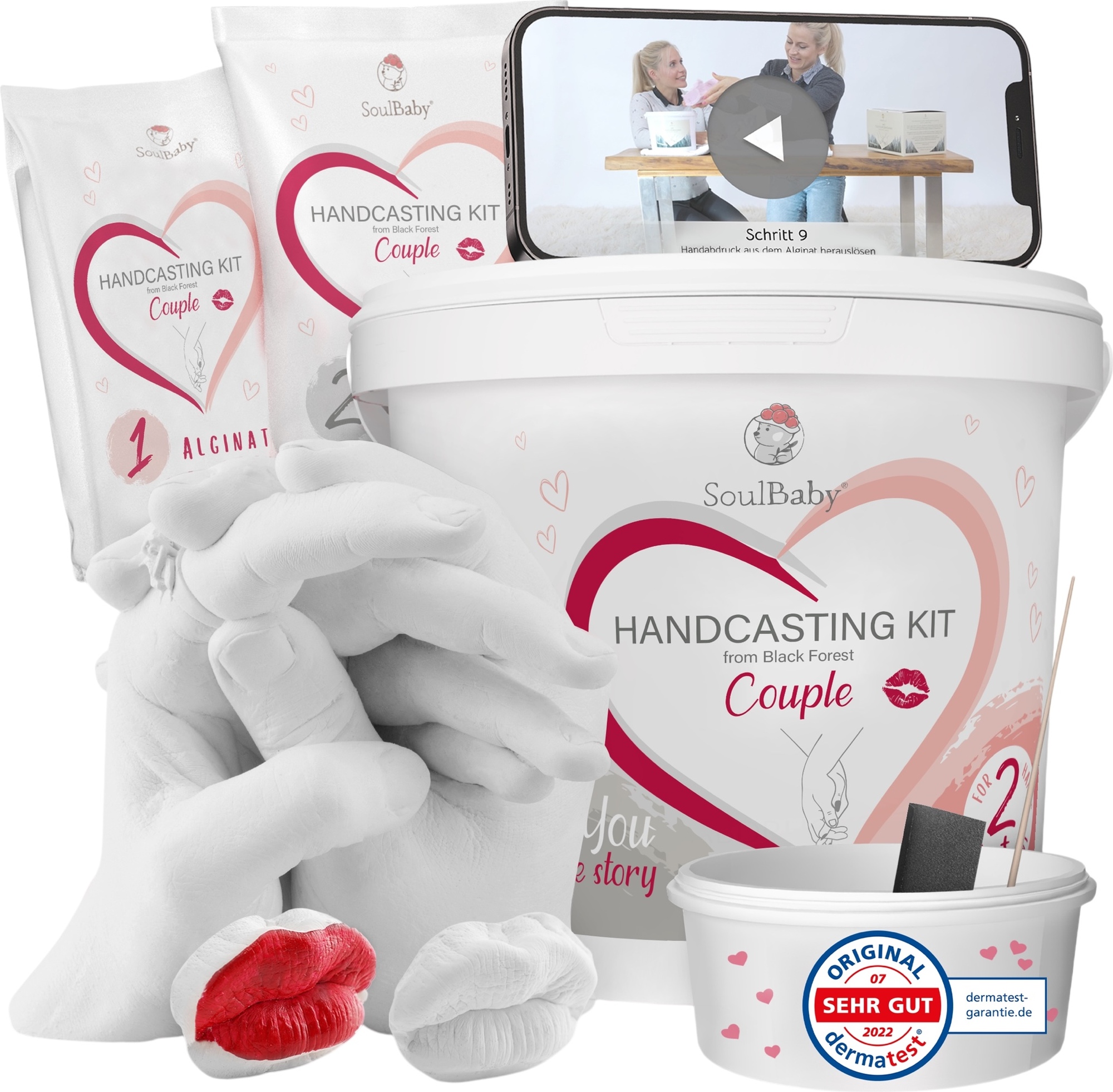 Premium kompletný set od SoulBaby® - máte všetko, čo potrebujete pre detailný odliatok ruky a spoločné šťastné chvíle Extra odliatok pier - Vďaka extra alginátu a formovaciemu poháru v súprave odliatkov rúk môžete okrem sadrového odliatku vytvarovať aj 2 bozkávacie ústa - perfektný doplnok k sadrovému odliatku ruky! Jednoduchý a bezpečný - návod krok za krokom, videonávody Dermatologicky testované materiály z Nemecka robia súpravu 3D odliatkov rúk pre páry úplne šetrnou k pokožke. Ideálne ako darček k výročiu svadby. Obsahuje darčekové balenie - či už ako darček k výročiu alebo darček pre pár - vďaka elegantnému baleniu môžete darovať nádherný darček, ktorý zabezpečí dobre strávený čas a vytvorí spomienky